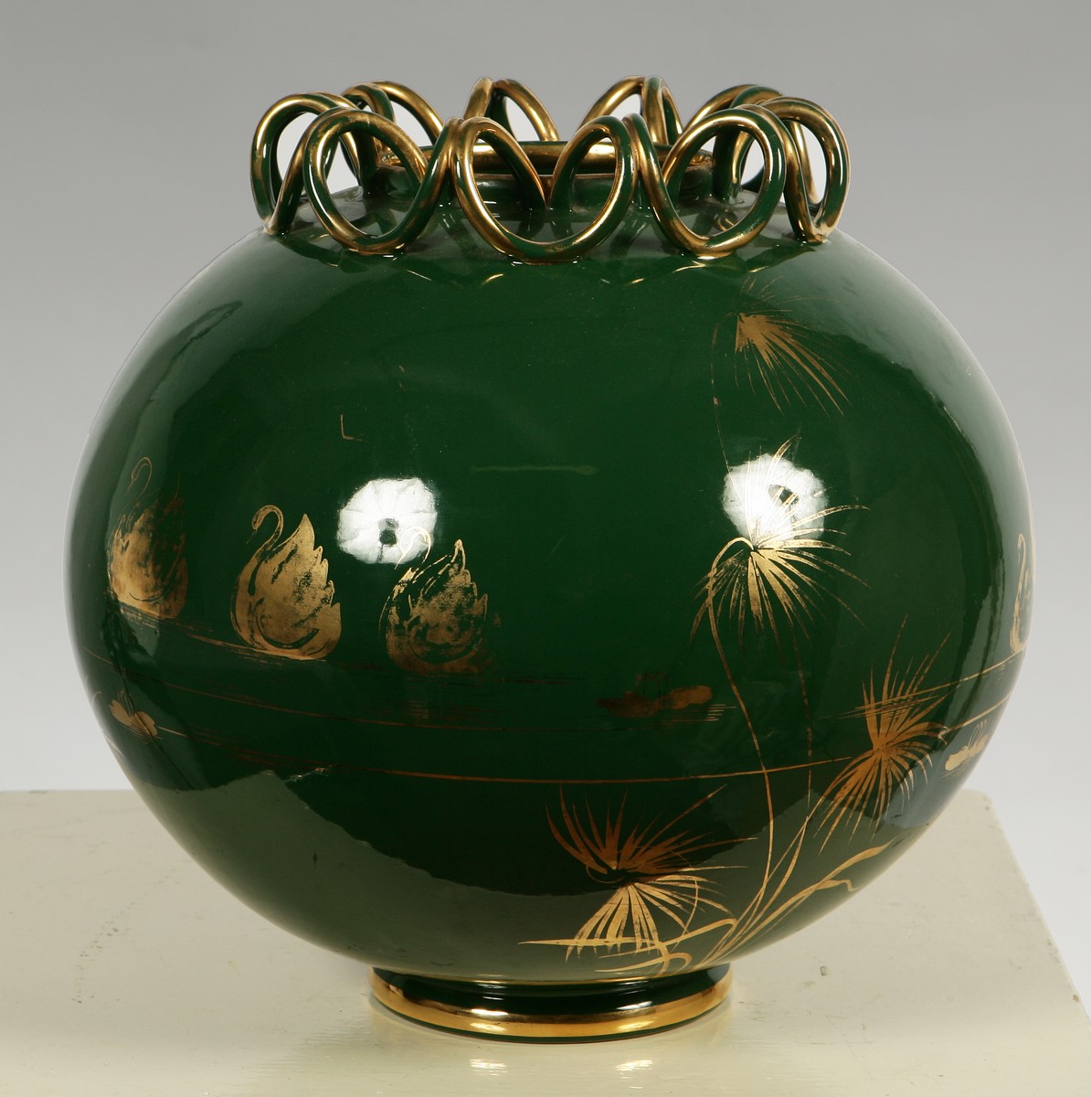 PRODUZIONE ITALIANA - ITALIAN WORK. Vaso ceramica verde con decorazioni oro. Big green ceramic vase with gold decorations. Ceramica. Cm 36x34. Sesto Fiorentino, anni ’40. From Sesto Fiorentino.1940.