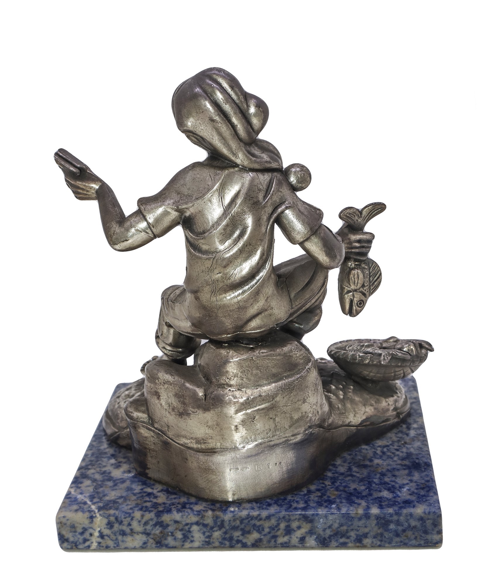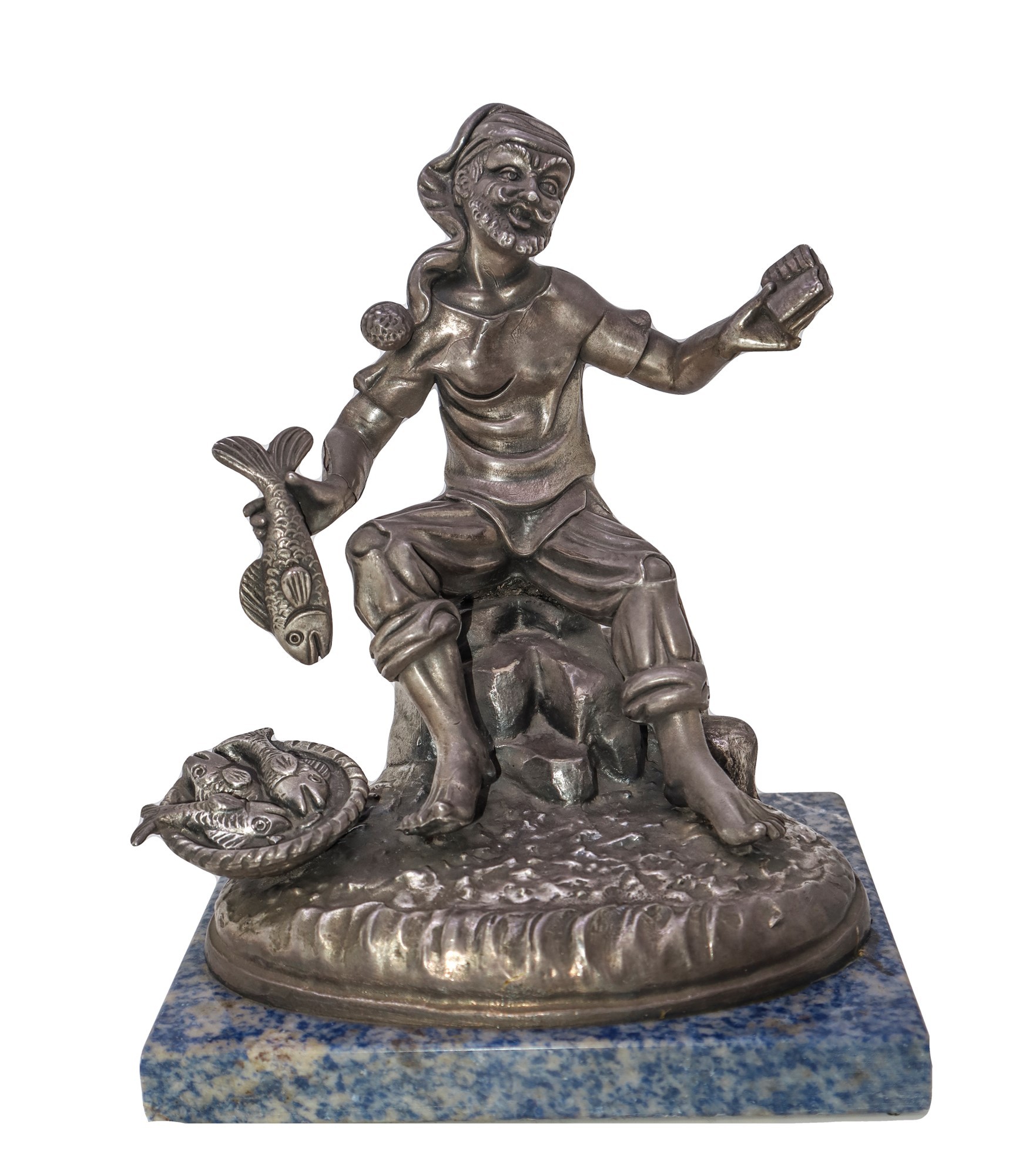 Pescatore H cm 21, base cm 17 x cm 14 Scultura ricoperta in lamina d'argento, con base in marmo.