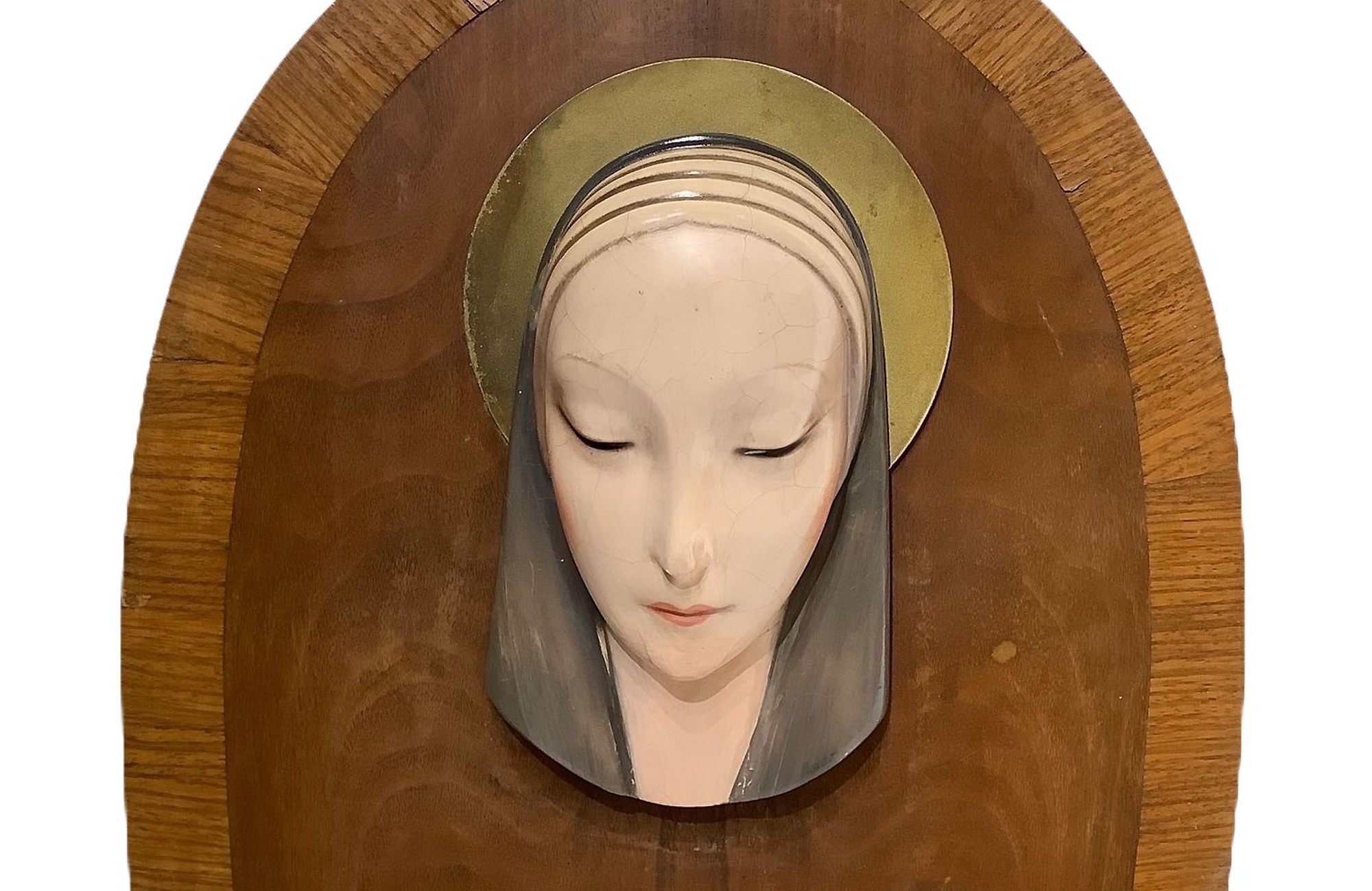 G. Launeck (XX secolo) - Capezzale con volto di Madonna in gesso policromo, 1950s