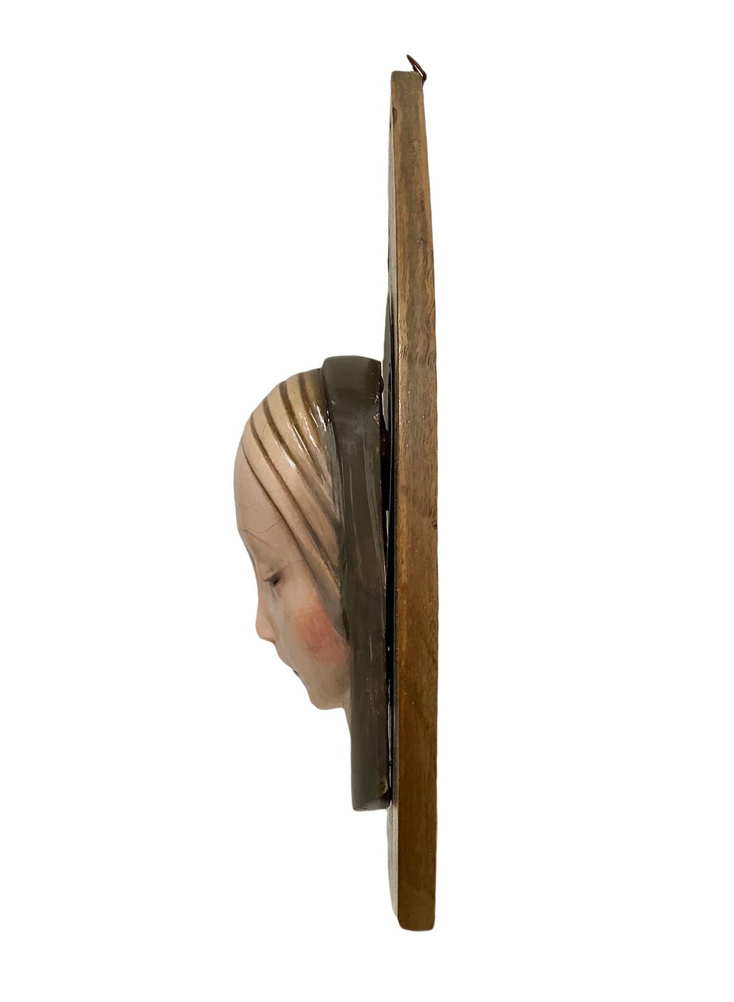 G. Launeck (XX secolo) - Capezzale con volto di Madonna in gesso policromo, 1950s h cm 41 x cm 36 In gesso policromo, base in legno cuspidata