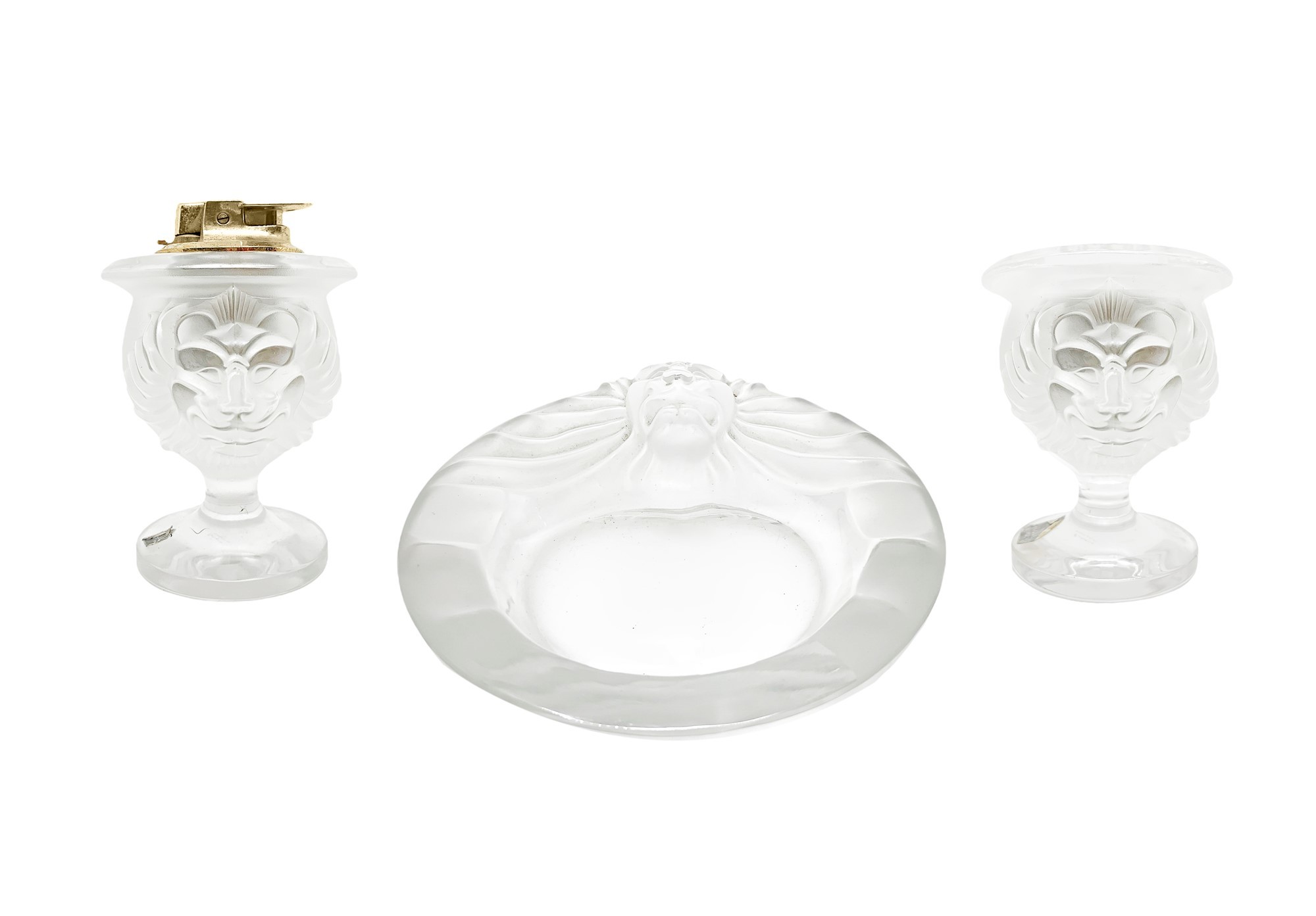 Lalique (1888) - Set da fumatore in cristallo , France, 20th century Posacenere diametro cm 15; portasigarette h cm 9,5; accendino h cm 12 Composto da 3 pezzi: posacenere, portasigarette e accendino. Ottime condizioni