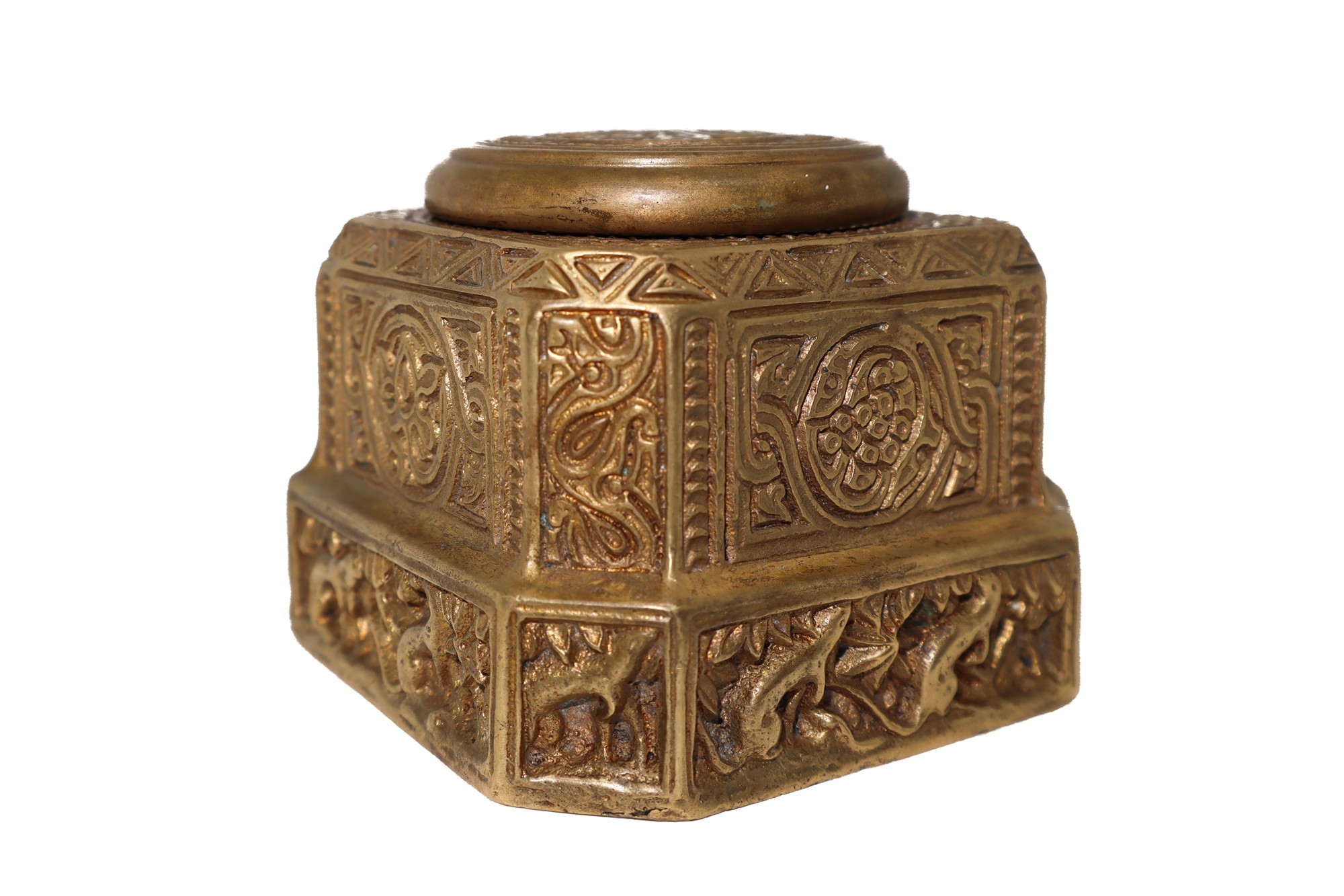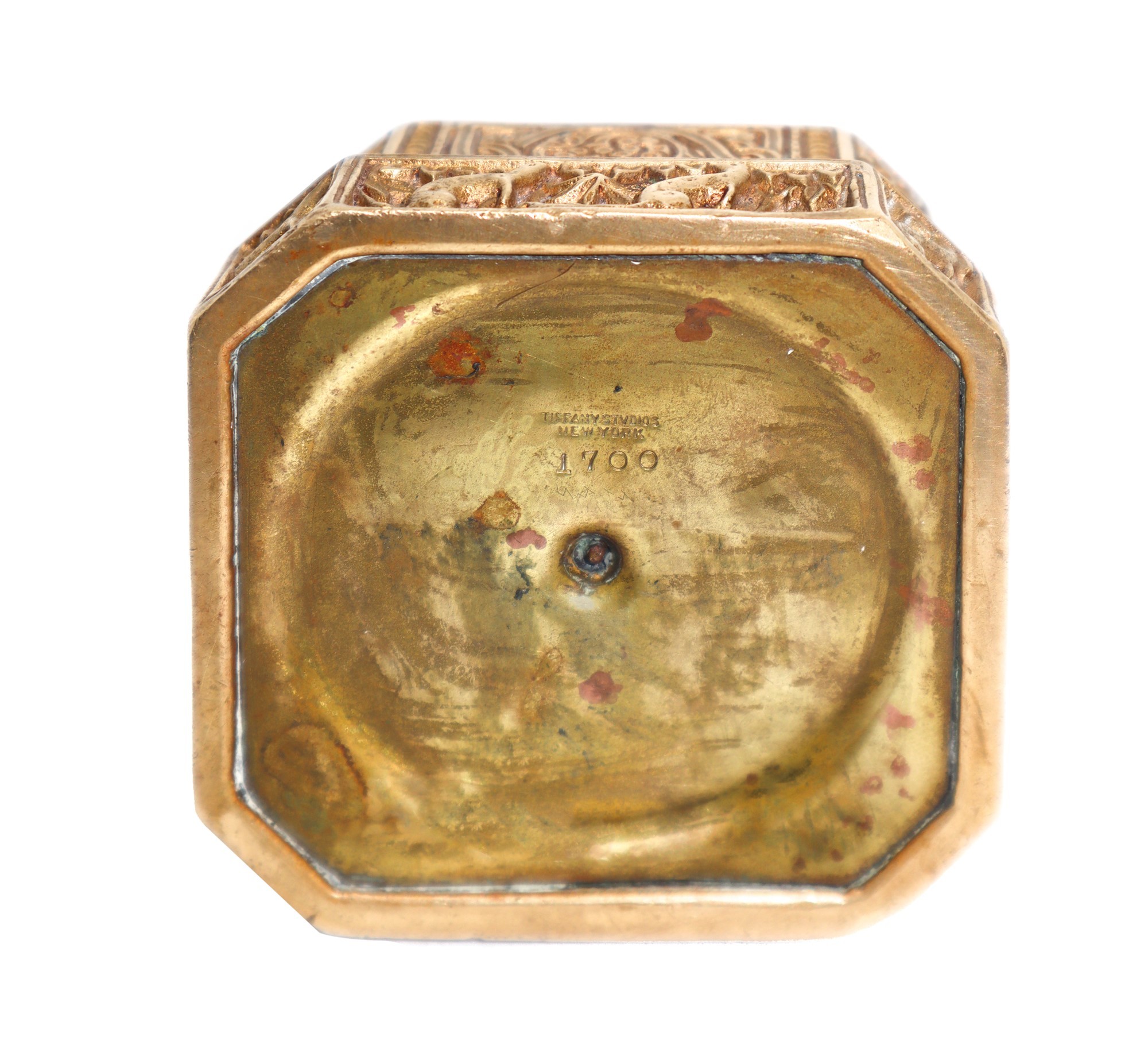 Tiffany Studios (American 1902-1932) - Calamaio in bronzo dorato, 1920s h 60 x 75 x 75 mm Calamaio in bronzo dorato, motivo veneziano, fondo punzonato "TIFFANY STUDIOS / NEW YORK / 1700".