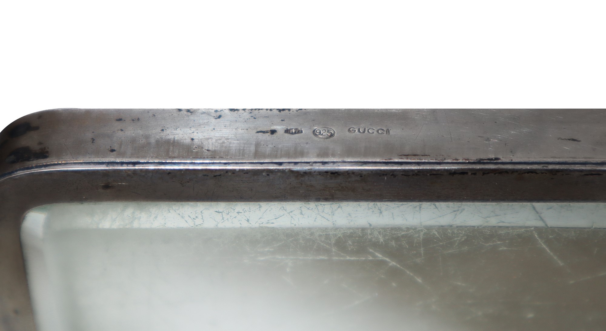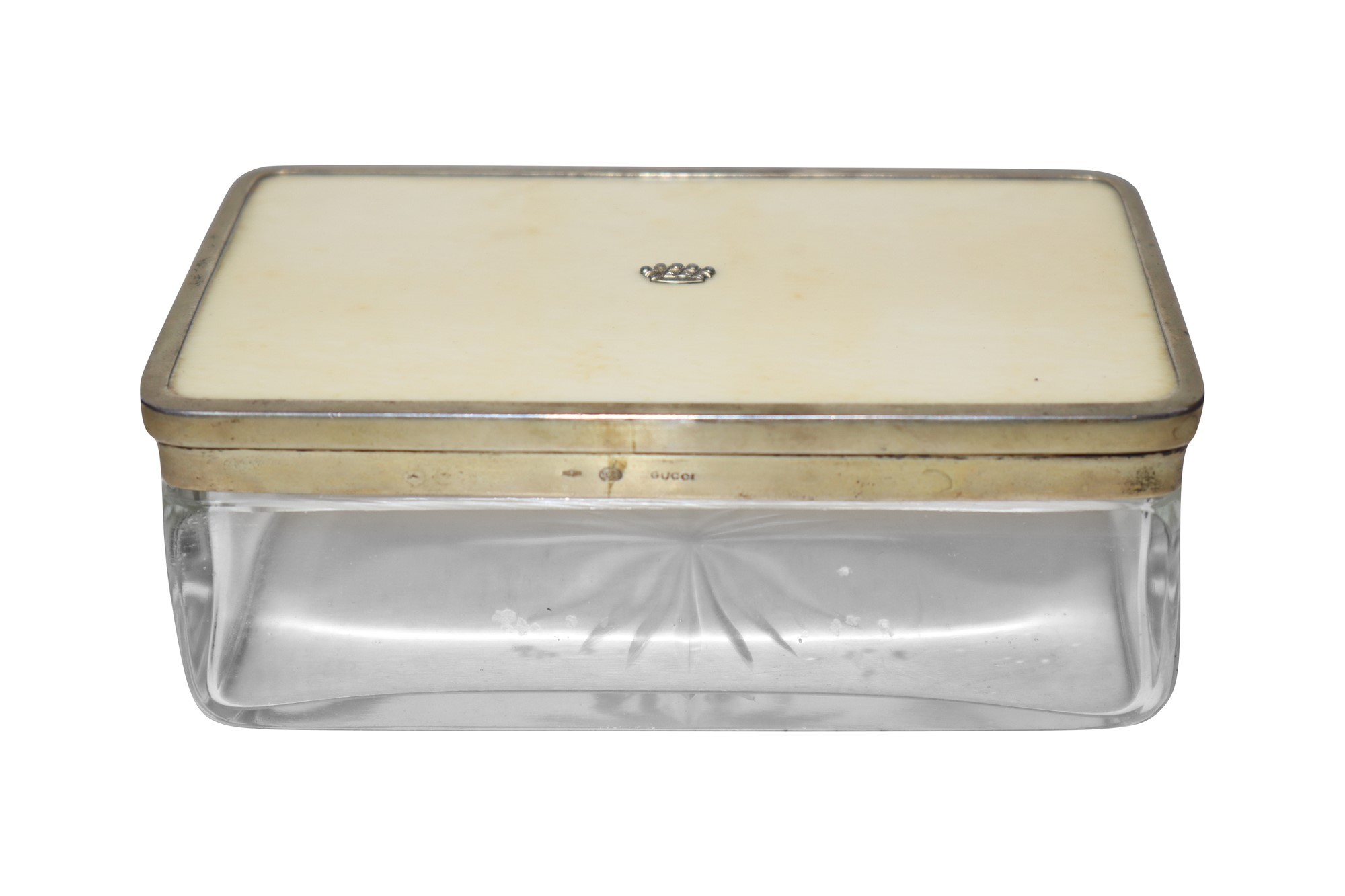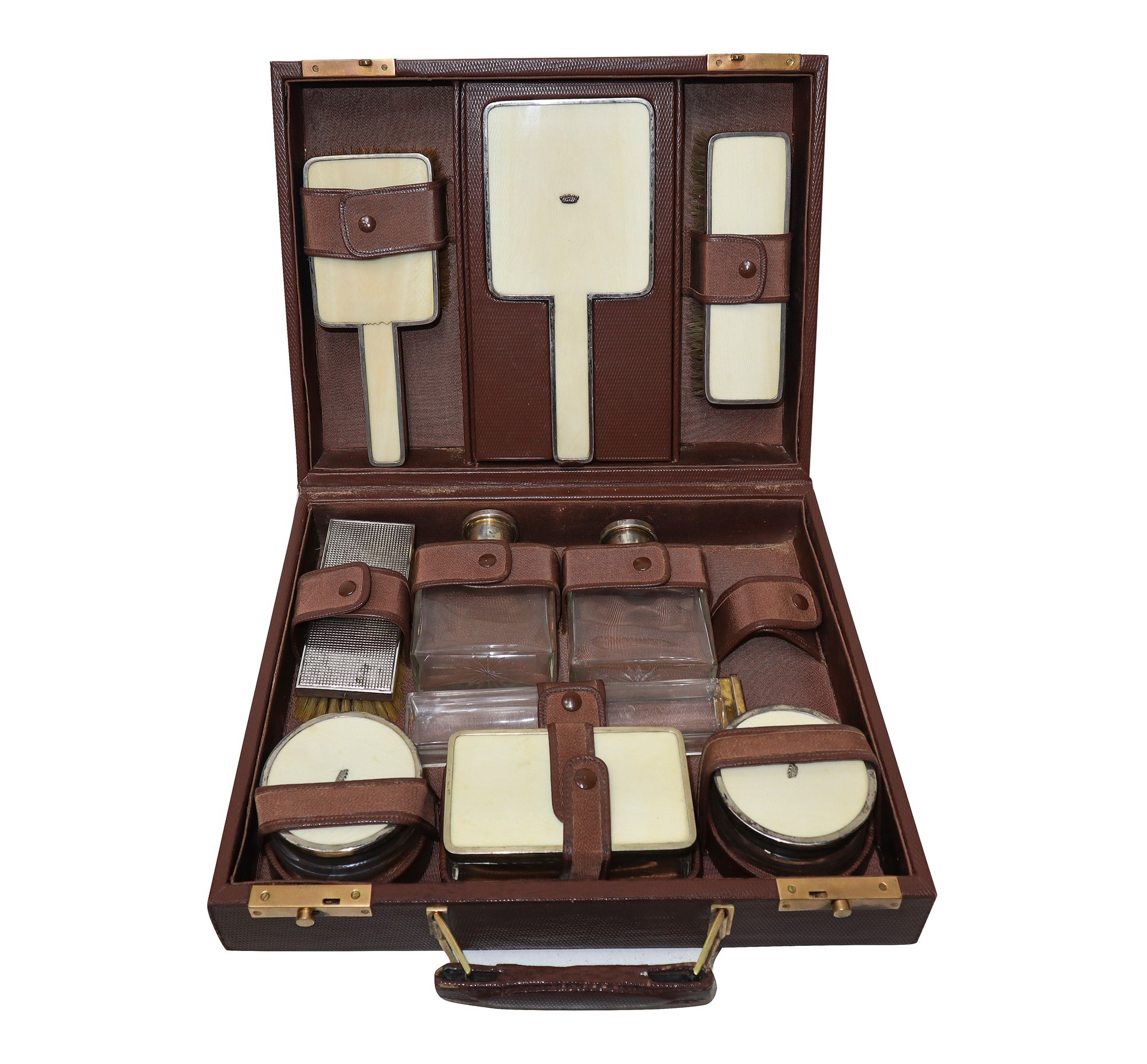Gucci - Necessaire uomo-donna, Early 20th century cm 32 x cm 26 x cm 11 Rivestito in pelle di lucertola, in vetro avorio e in argento. Composto da specchio, spazzole, boccia profumo, portaspazzolino e altro.