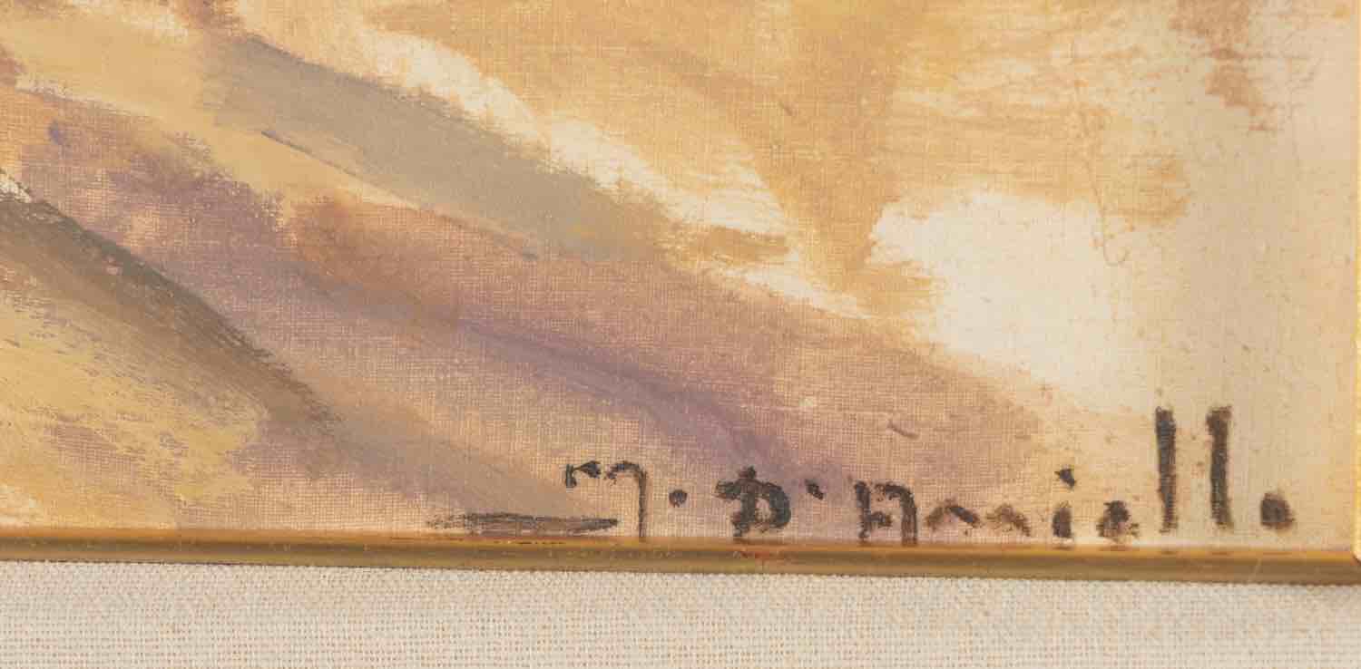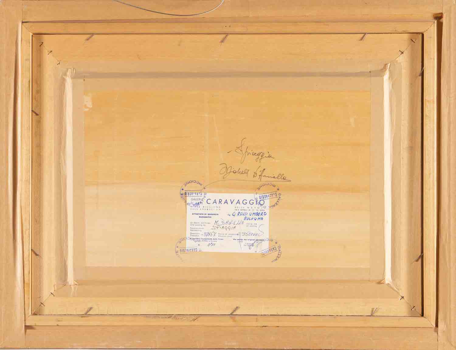 Olio su tela, firmato in basso a destra, reca al retro titolo e firma ed etichetta e timbri della Galleria d’Arte Caravaggio con autore, titolo, dimensioni, H cm 37x57