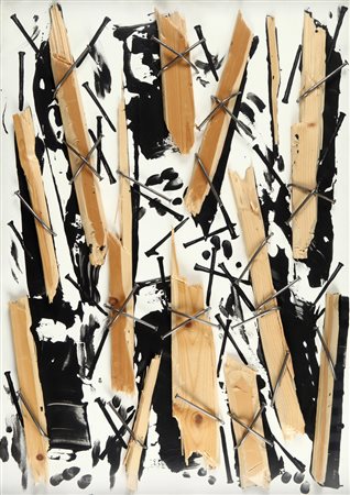 GUNTER UECKER (1930-) Splitter 1999 chiodi, acrilico su legno su carta su tavola cm 80x57 firmato e datato sul retro autentica dell'artista su fotografia etichetta galleria Edith Wahlandt,Stoccarda provenienza: galleria Edith Wahlandt,Stoccarda Splitter 1999 nails,acrylic and wood on paper o...