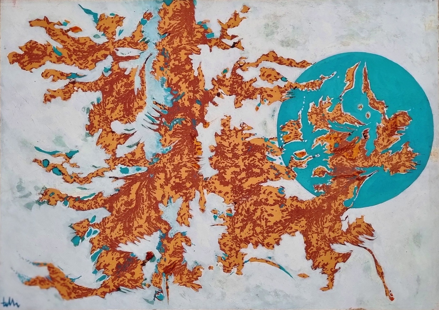 TULLI WLADIMIRO Macerata 1922-2003 “Con quella luna verde” acrilici e collage applicato su tavola cm 70x50 del 1965. Opera firmata sul fronte in basso a sinistra. Al retro titolo, data, firma ed etichetta della Galleria d’arte Stendhal. Esposta nella mostra personale dell’artista in Reggio Calabria.