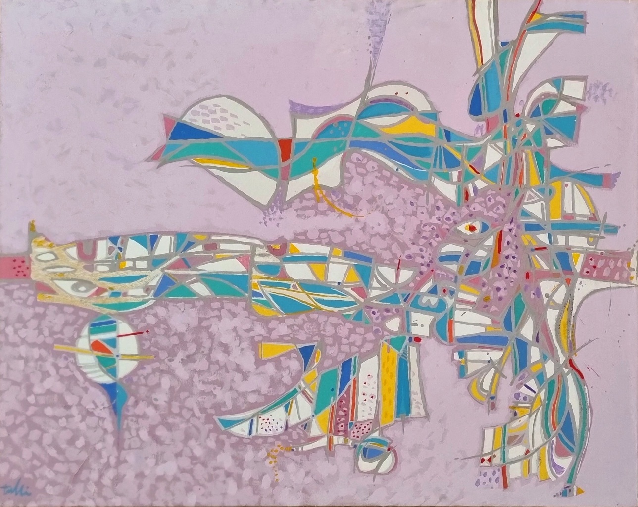 TULLI WLADIMIRO Macerata 1922-2003 “Per Vieira Da Silva” acrilici su tela applicata su tavola, cm 100x80 del 1977. Opera firmata sul fronte in basso a sinistra, sul retro titolo e anno.