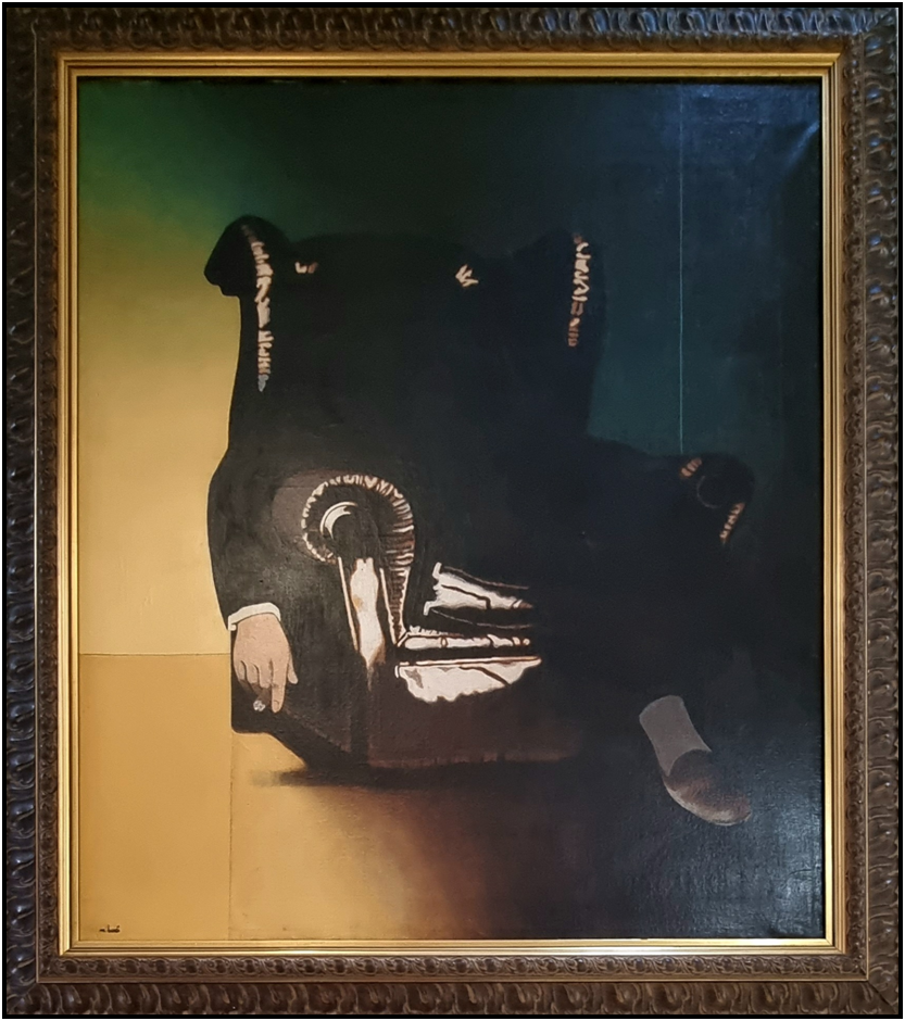 BARDI MARIO Palermo 1922 - Milano 1998 "La poltrona nella penombra" Olio su tela cm 85x110 . Firmato sul fronte in basso a sinistra. Sul retro titolo, firma e dedica ad personam.
