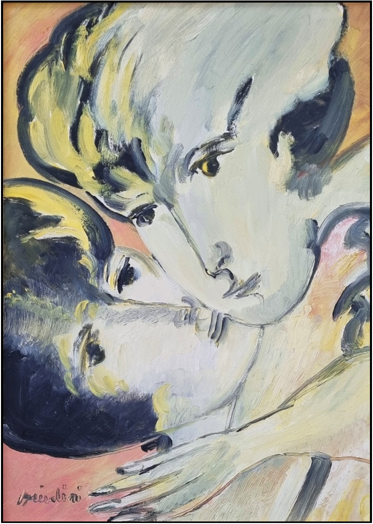 BRINDISI REMO Roma 1918 - Lido di Spina (FE) 1996 "Amore" Olio su tela cm 50x70 degli anni '80. Firmato sul fronte in basso a sinistra e sul retro. Autentica ed archivio su foto a cura dell'artista. Opera pubblicata a piena pagina 188 del Catalogo Generale opere di Remo Brindisi, volume 2, rep. 3556. Provenienza collezione Silva Milano. Si ringrazia l'Archivio per il riscontro dell'opera.
