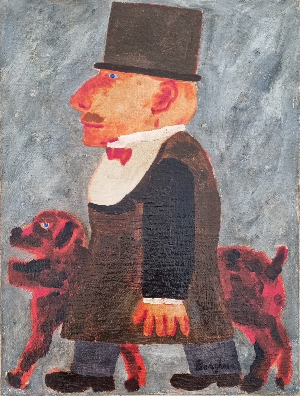 BORGHESE FRANZ Roma 1941 - 2005 "Personaggio con cane" Olio su tela cm 30x40.
