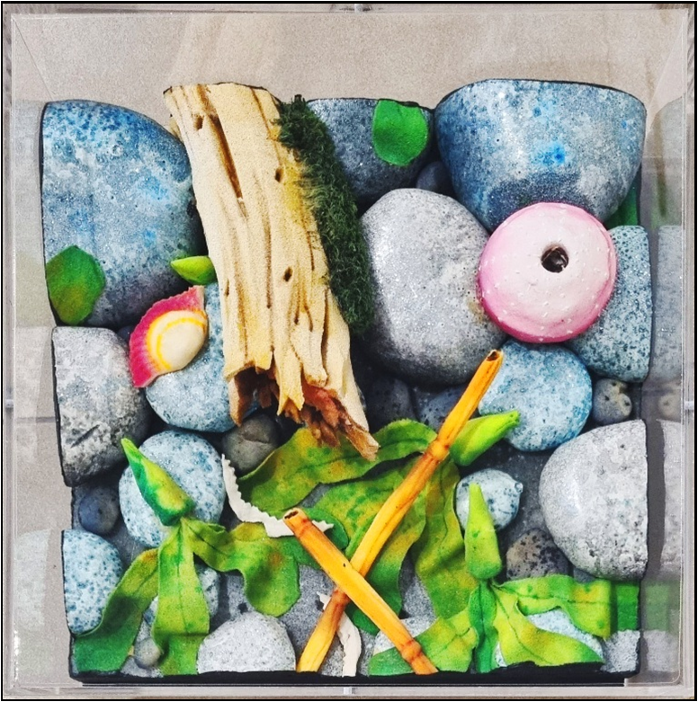 GILARDI PIERO Torino 1942 "Spiaggia con alghe" Poliuretano espanso in teca di plexiglass cm 30x30x15. Sul retro titolo e firma. Autentica su foto a cura dell'artista.