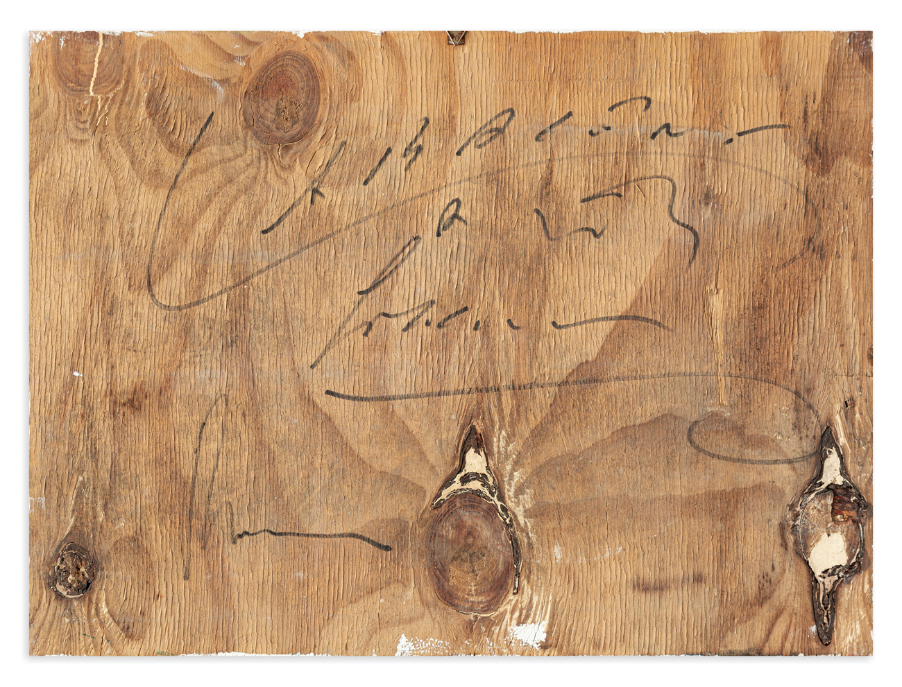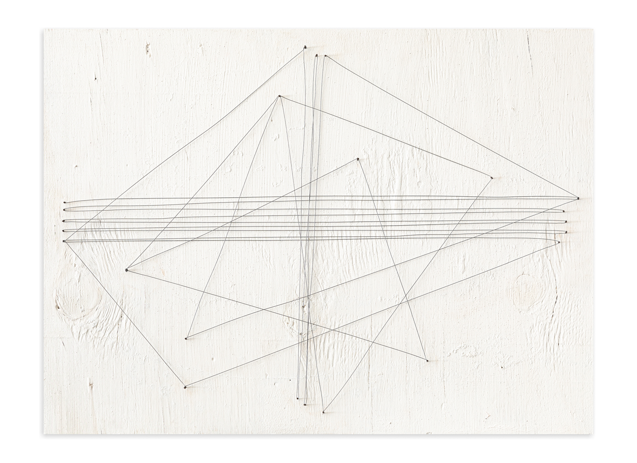 Acrilici, filo di ferro e chiodi su tavola