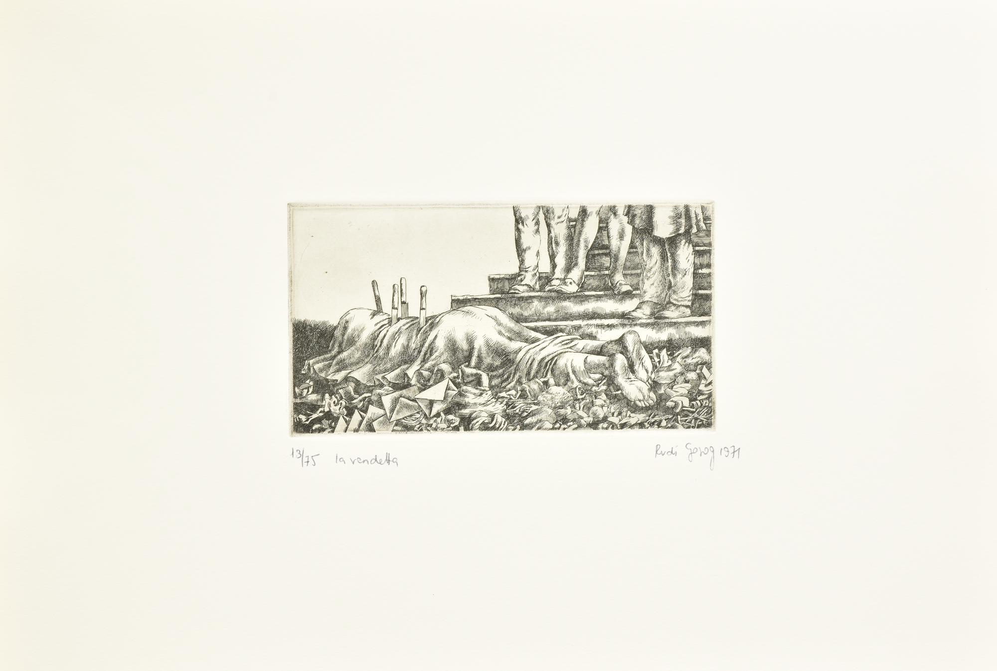 Rudi Gorog LA VENDETTA incisione su carta Fabriano, battuta cm 11x20, su...