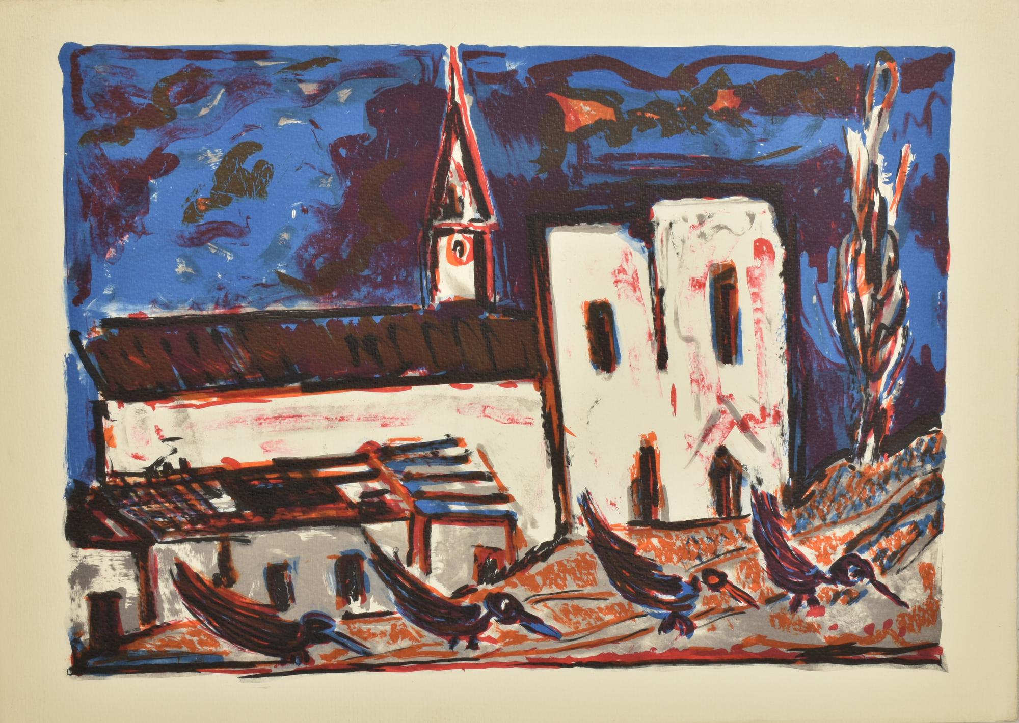 Corrado Spaziani CHIESETTA SVIZZERA litografia su carta, cm 50x70 retro:...