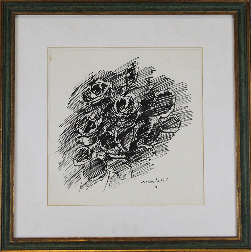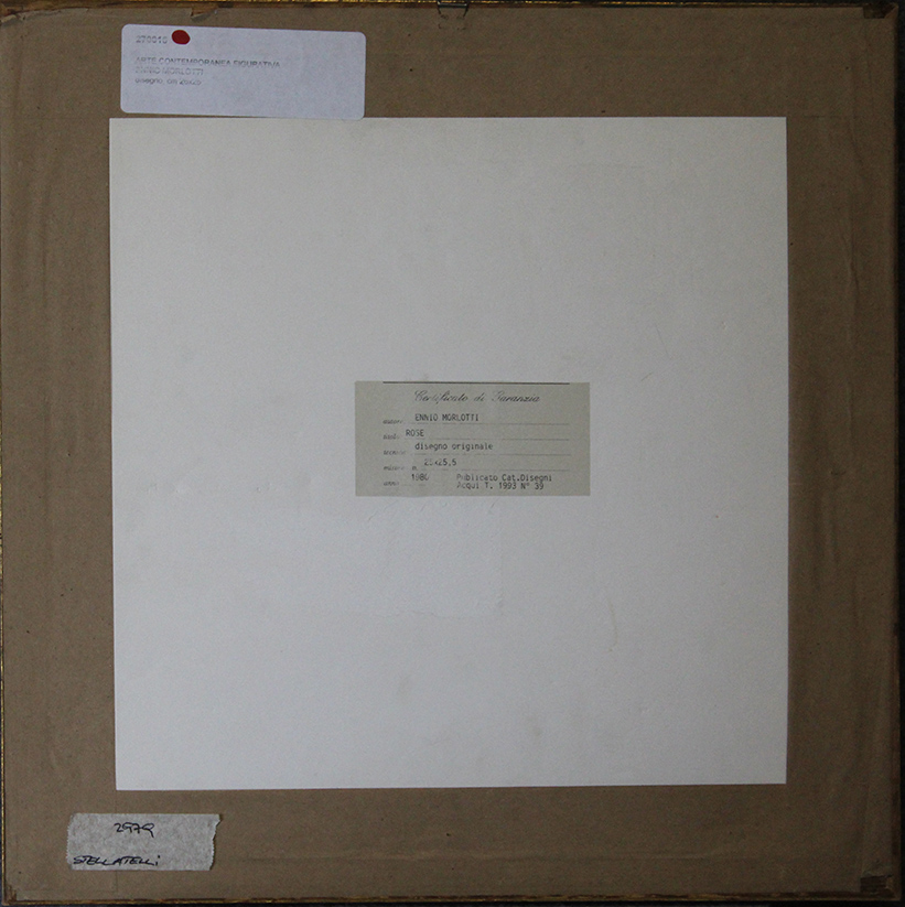 ENNIO MORLOTTI, "Rose", 1980, China su cartoncino, Dim. 25x25.5, Al fronte: in basso a destra firma, Al verso: certificato di garanzia, Opera pubblicata in Catalogo disegni Aquiterme nel 1933 al numero 29, Opera con cornice