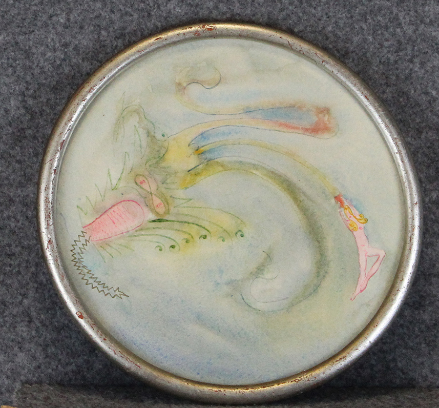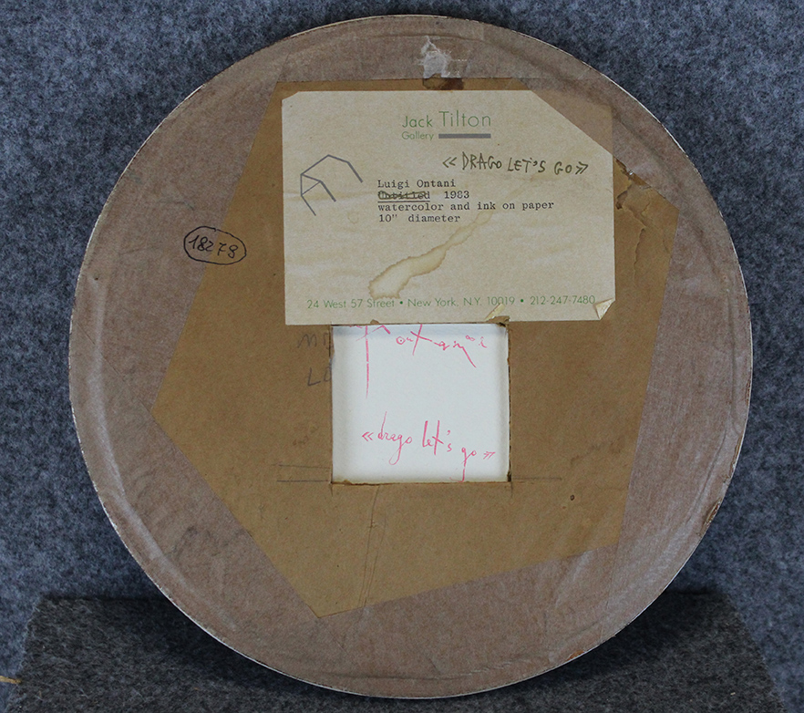LUIGI ONTANI, "Drago let's go", 1983, Acquerello su cartoncino, Diametro 26 cm, Al verso: etichetta Galleria Jack Tilton New York, Al verso: titolo e firma