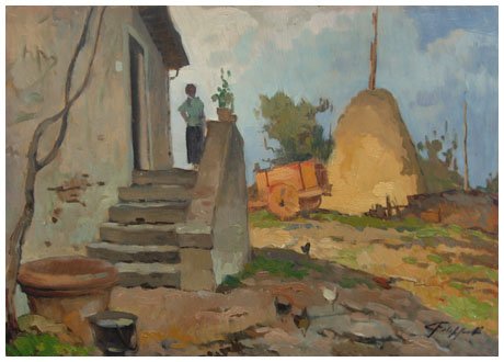 CAFIERO FILIPPELLI Livorno 1889 – 1973 Pagliaio Olio su tavola 25 x 35. Firma in b. a d.; sul verso titolo + timbro e firme Romano Sefanini, Livorno + timbro di proprietà “Vannucci Silva”.