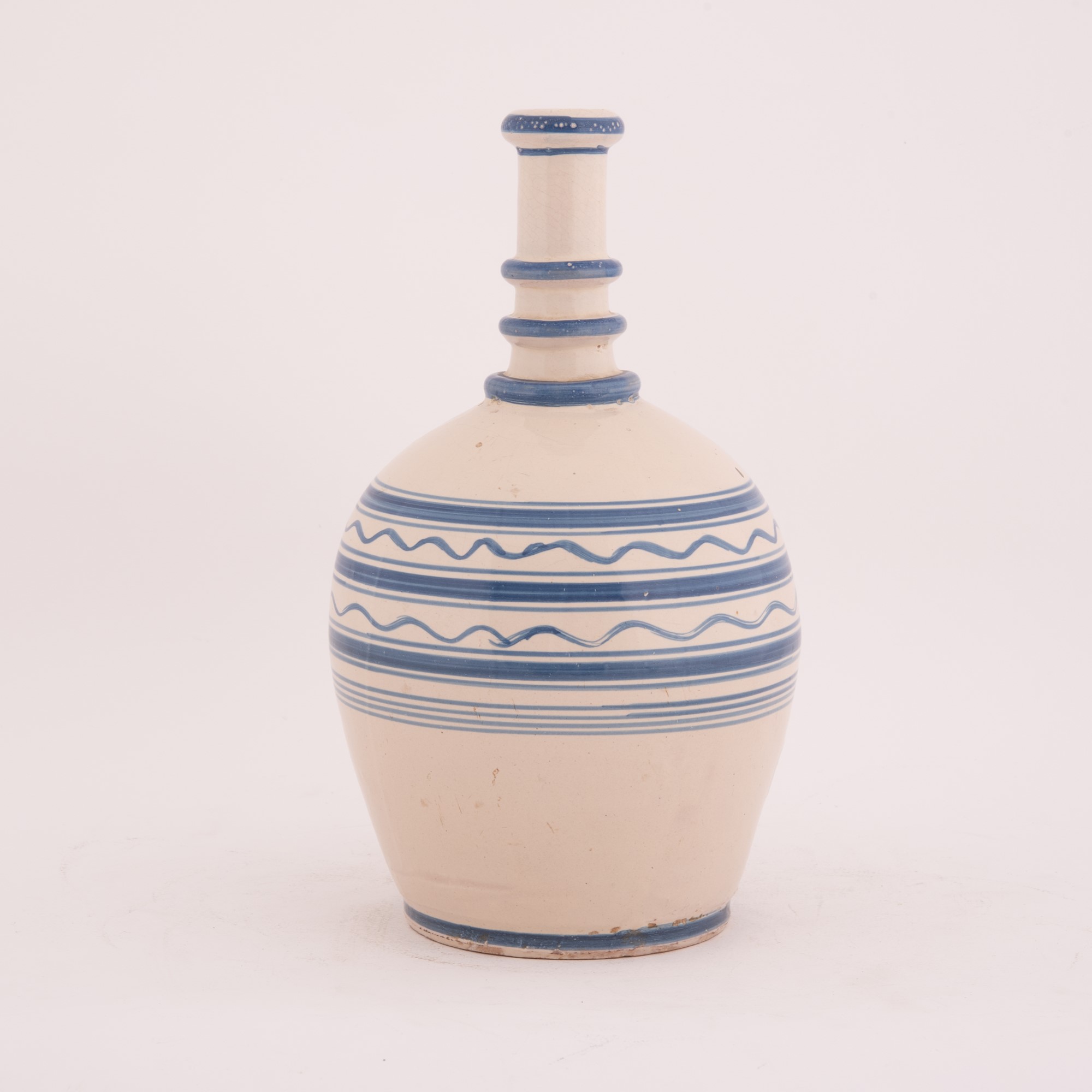 Bottiglia in maiolica a fondo bianco. Corpo ovoidale decorato nei toni del blu a righe. Sul collo anelli a rilievo blu.