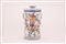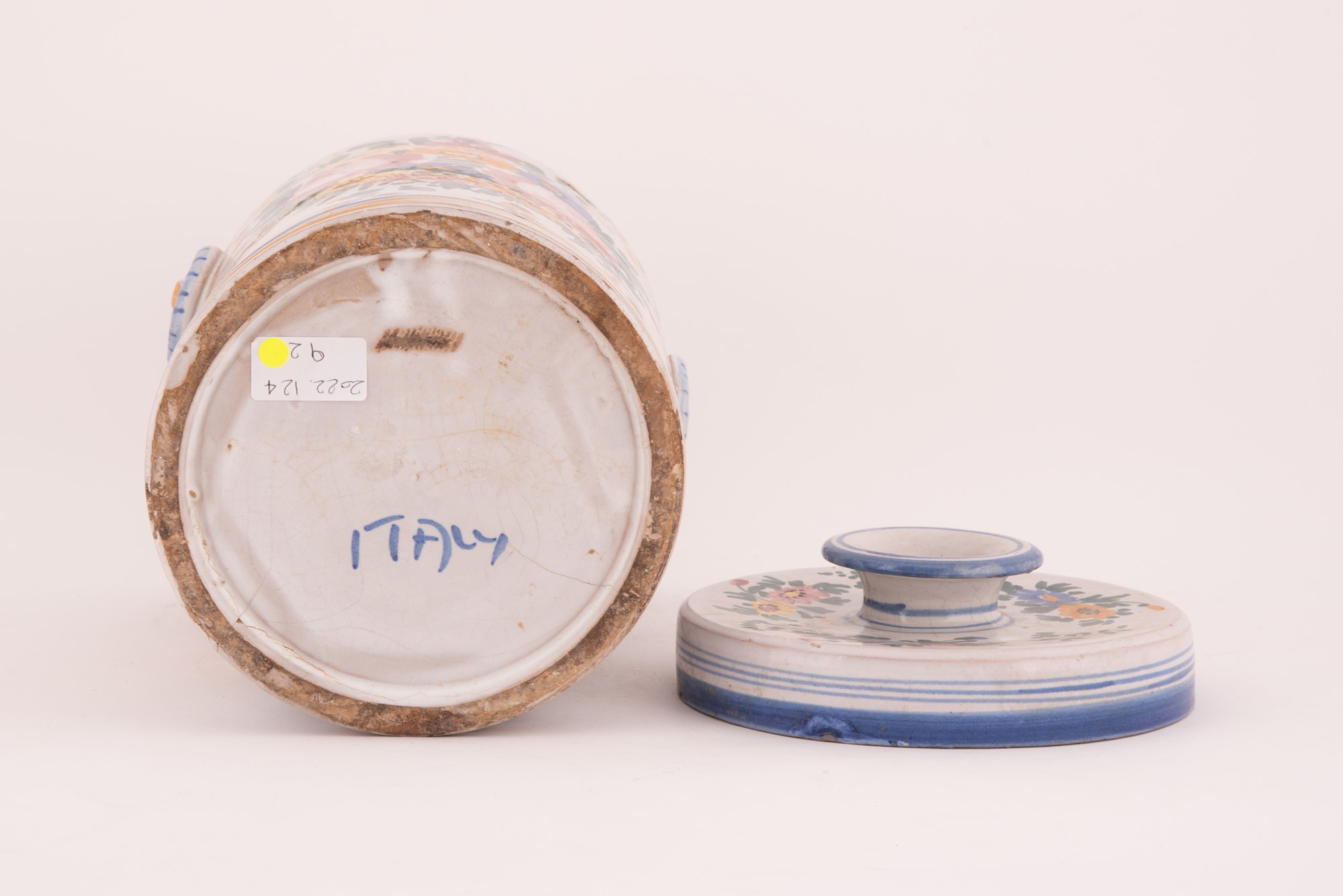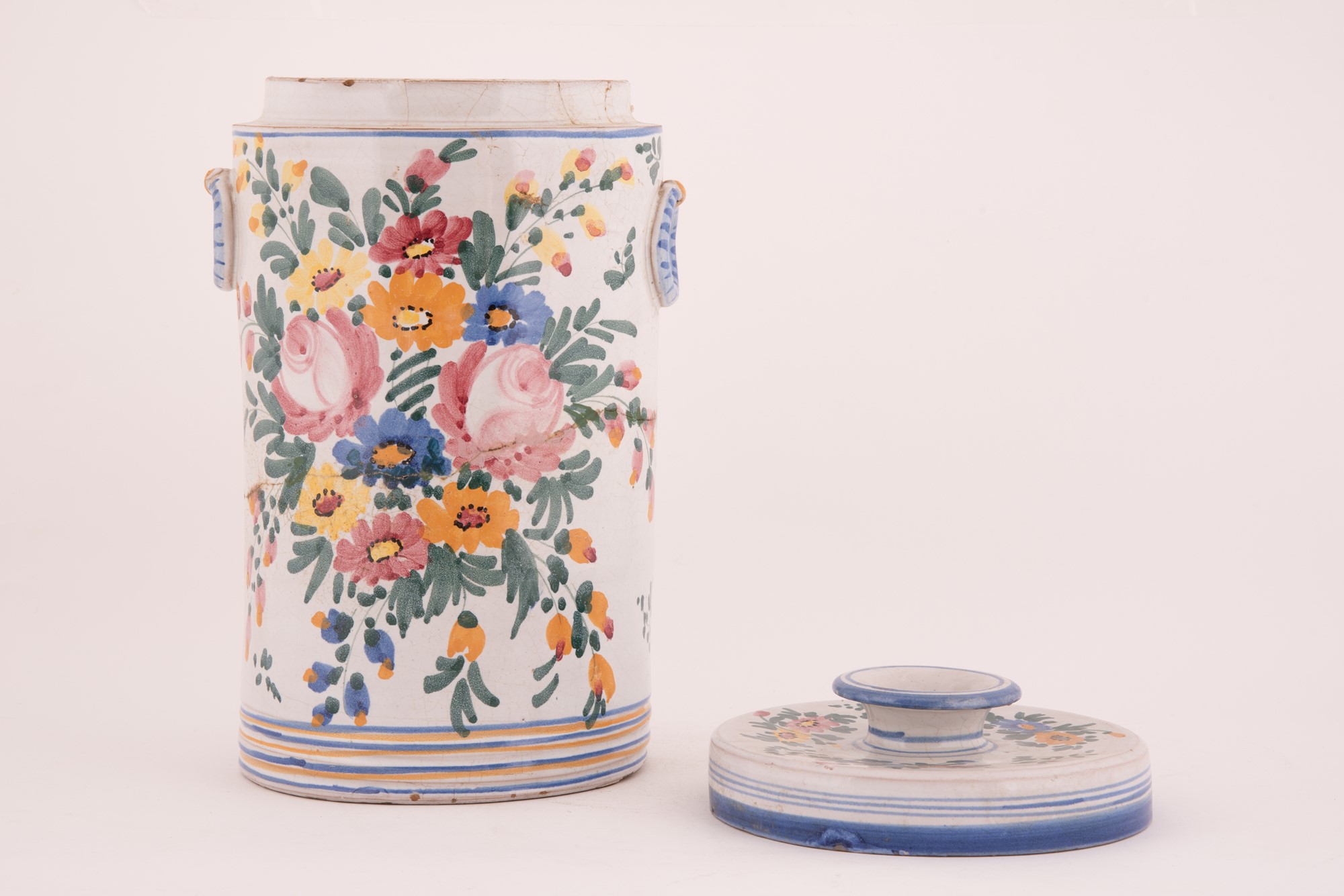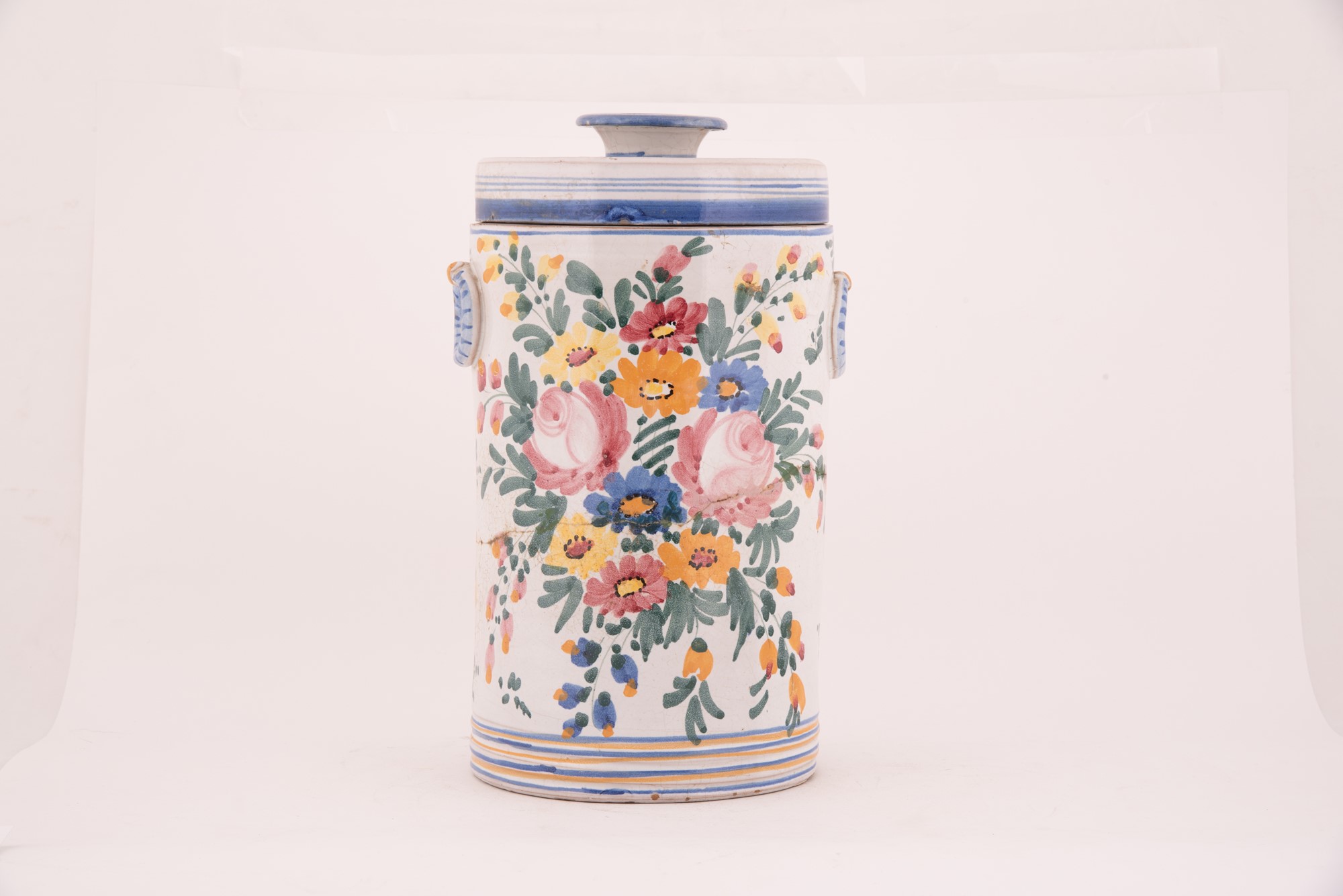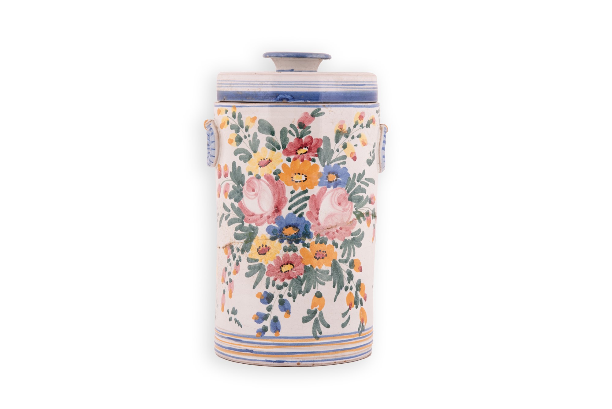 Manifattura castellana del XX secolo ( - ) Portasalsicce in maiolica decorato in policromia con tipico fiore castellano. Coperchio con presa decorato a righe nei toni del blu. altezza con coperchio cm 35; altezza senza coperchio cm 28