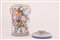 Portasalsicce in maiolica decorato in policromia con tipico fiore castellano. Coperchio con presa decorato a righe nei toni del blu.