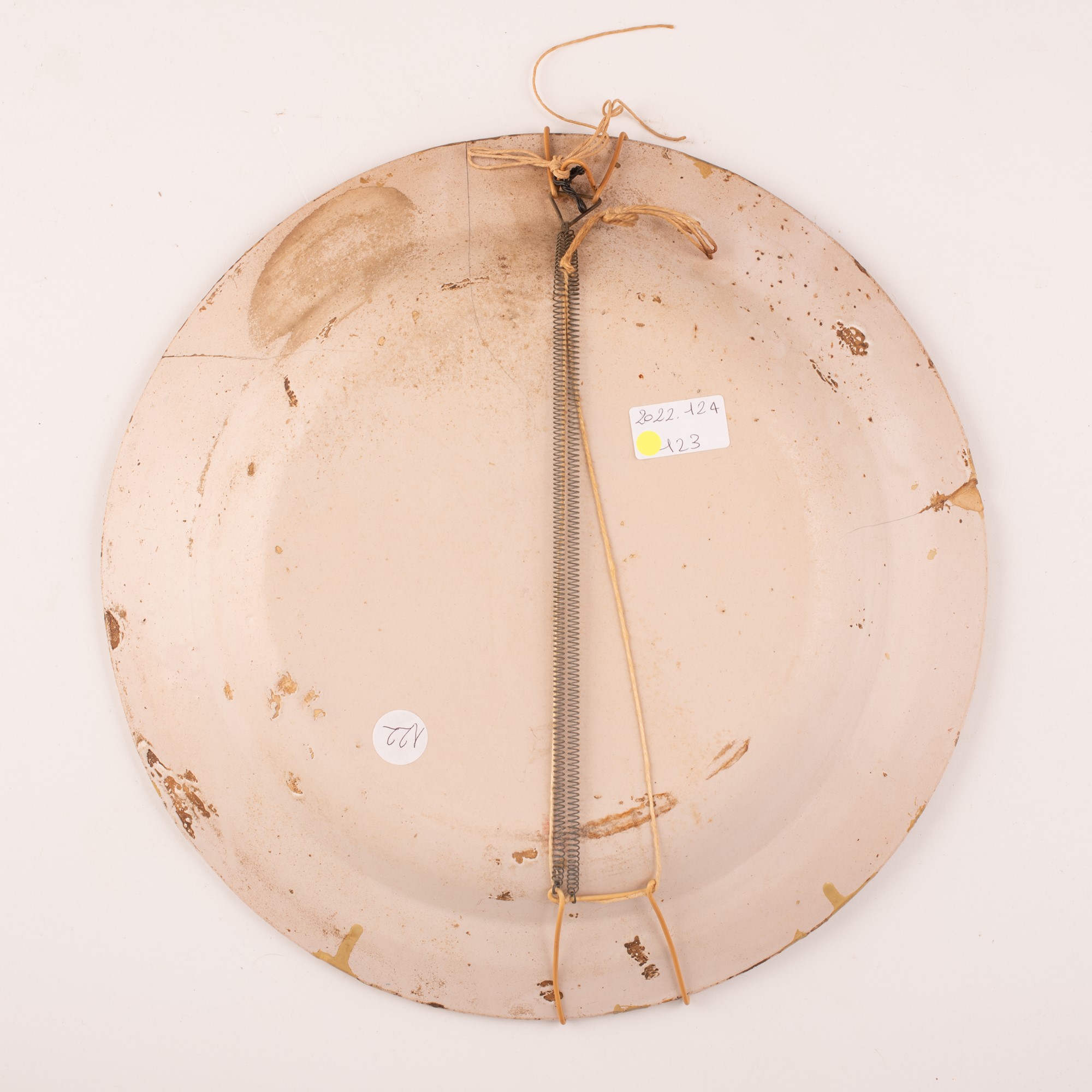 Manifattura castellana del XIX secolo ( - ) Grande piatto da portata in maiolica a fondo bianco, decorato in policromia con fiori e motivi vegetali blu e rossi realizzati a spugnetta. Ø cm 37