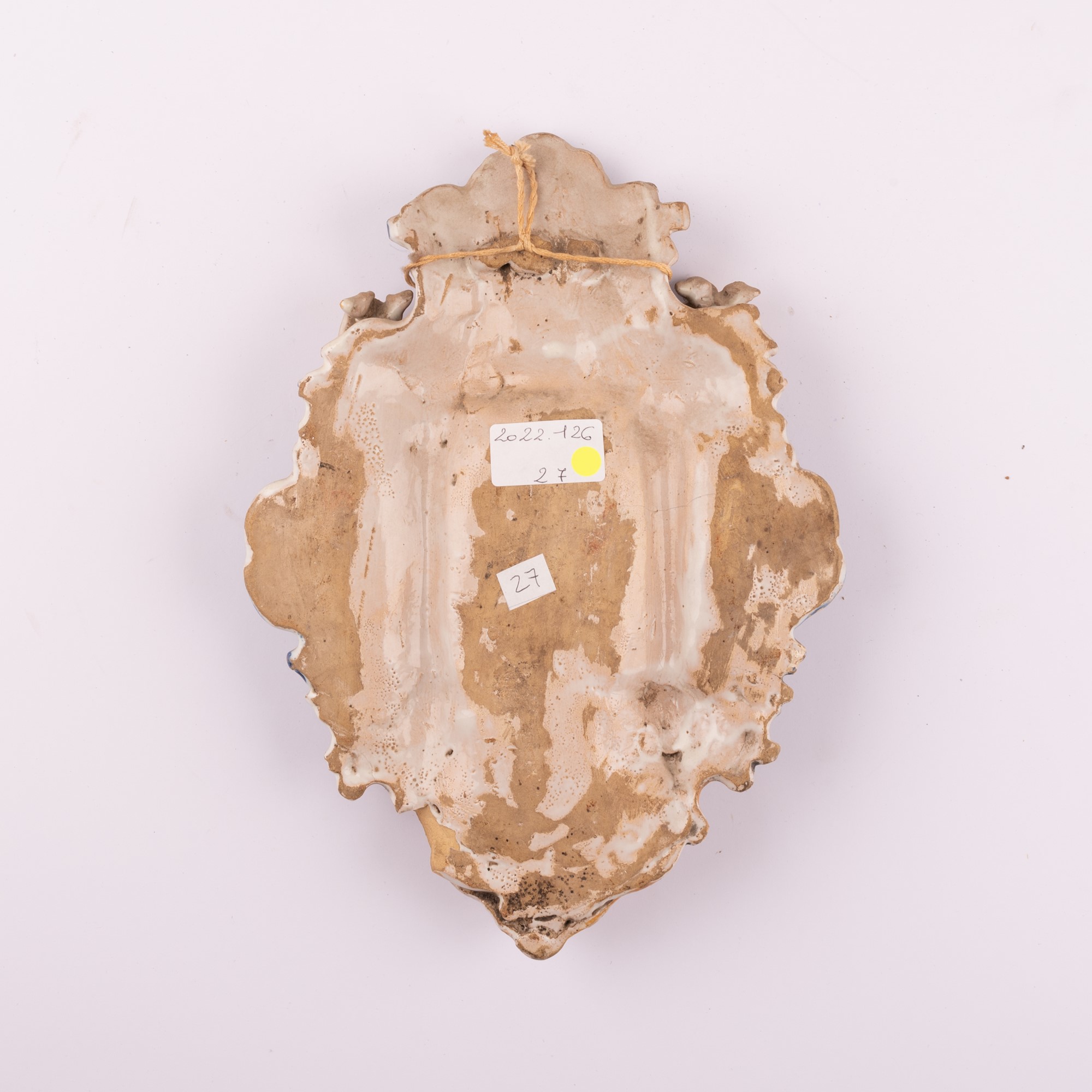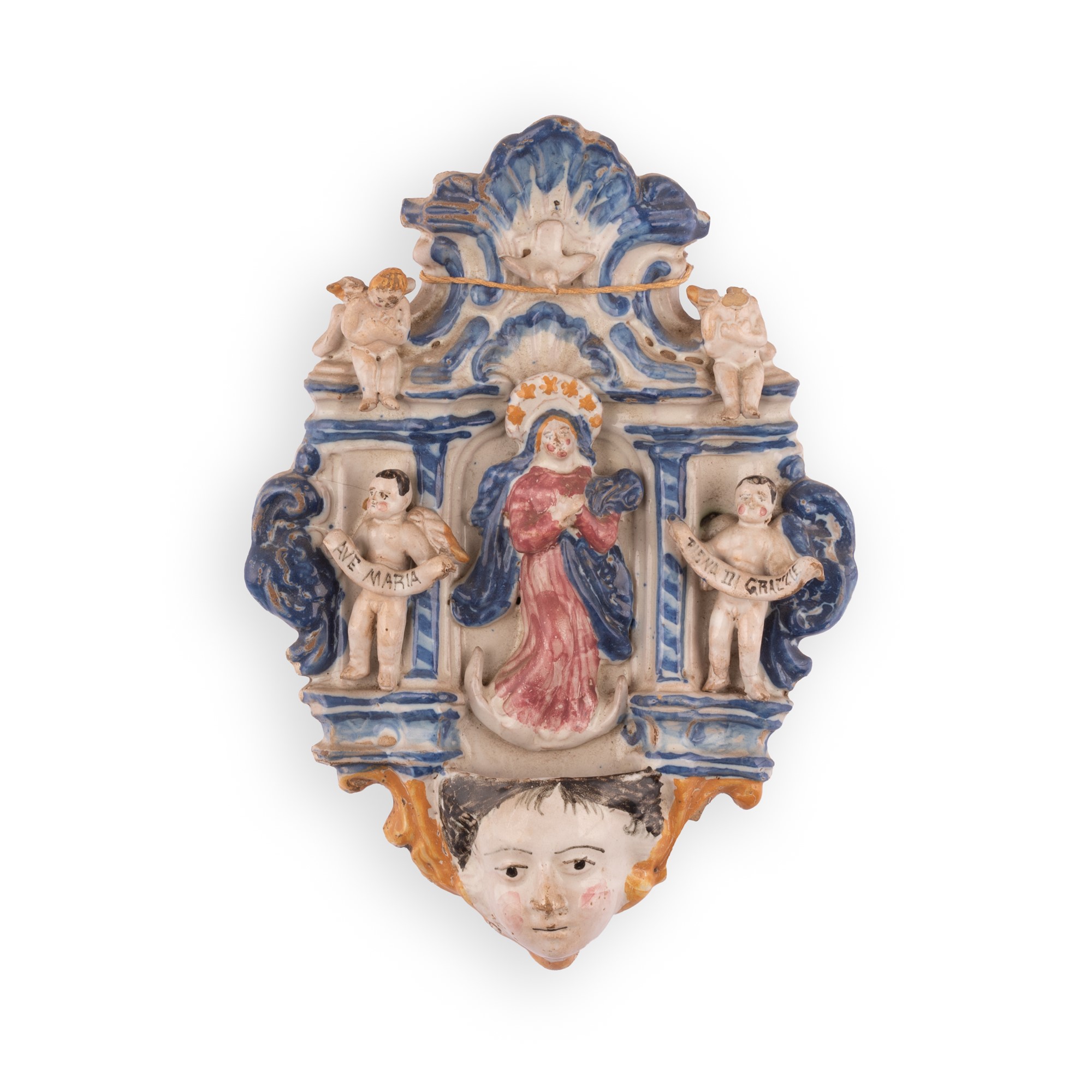 Manifattura castellana attiva negli ultimi decenni del XIX secolo ( - ) Acquasantiera in maiolica con decorazioni e figure in rilievo, recante al centro l'effigie dell'Immacolata. cm 28,5x21