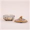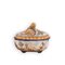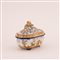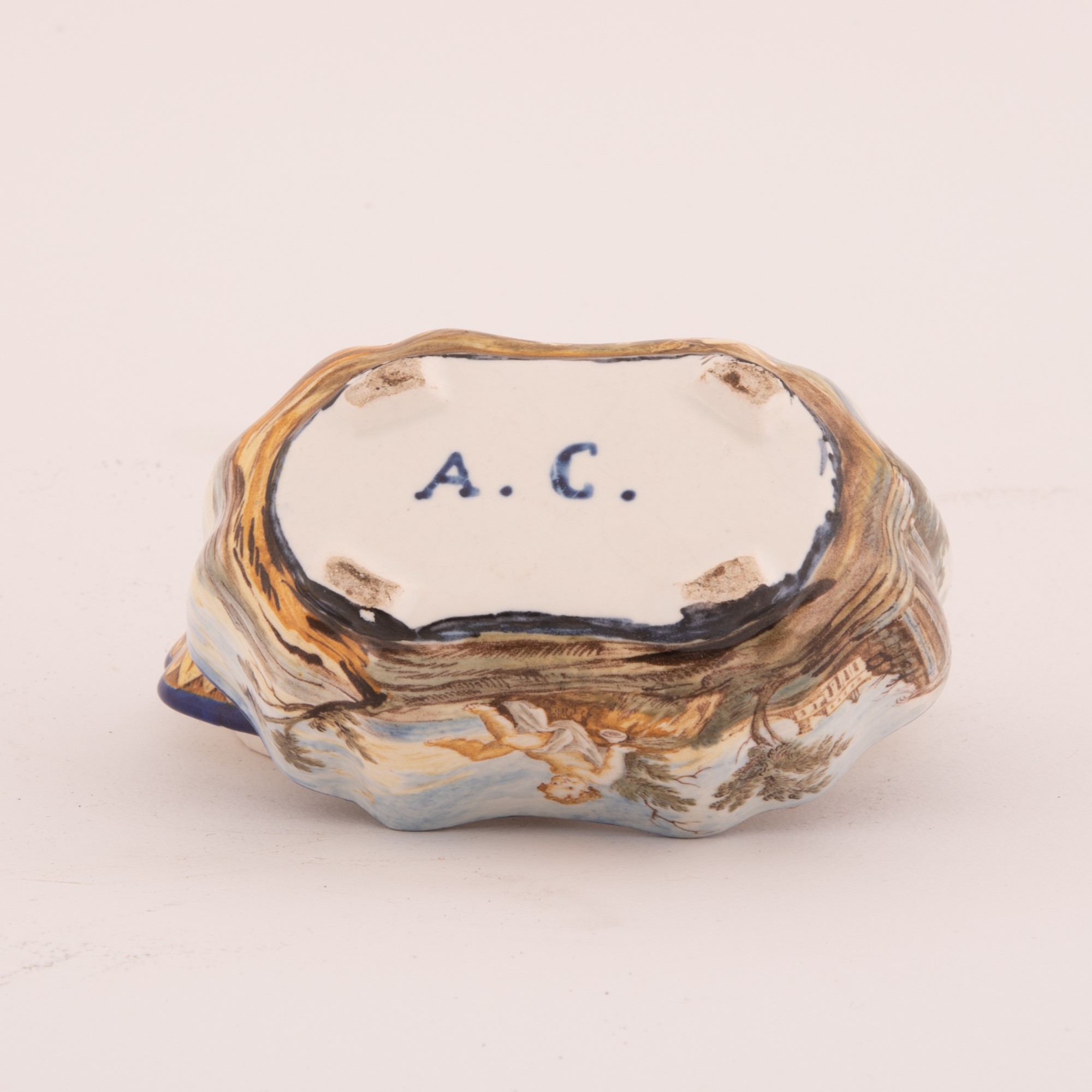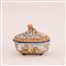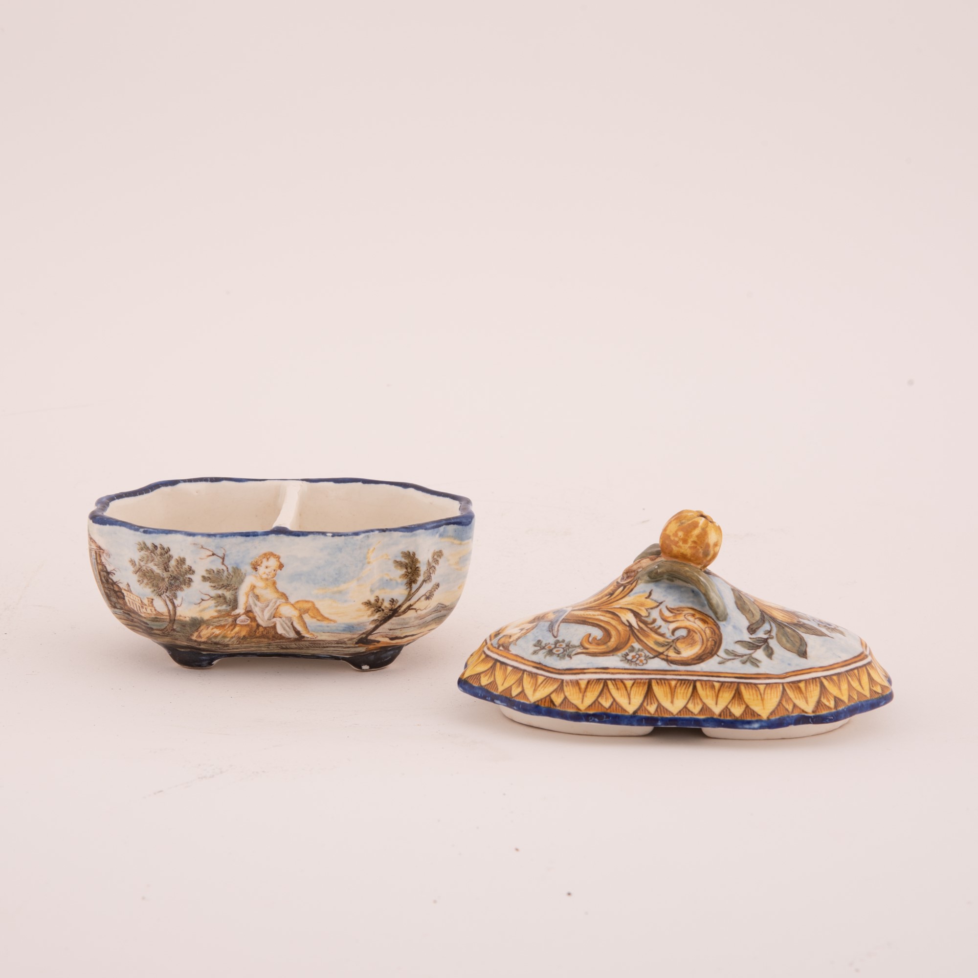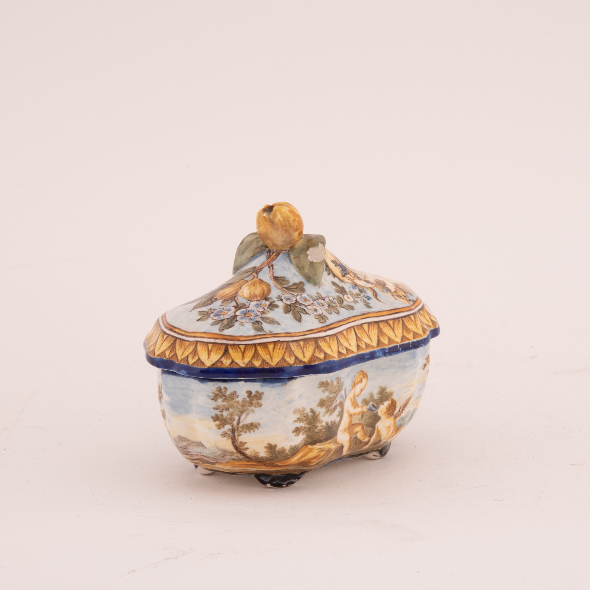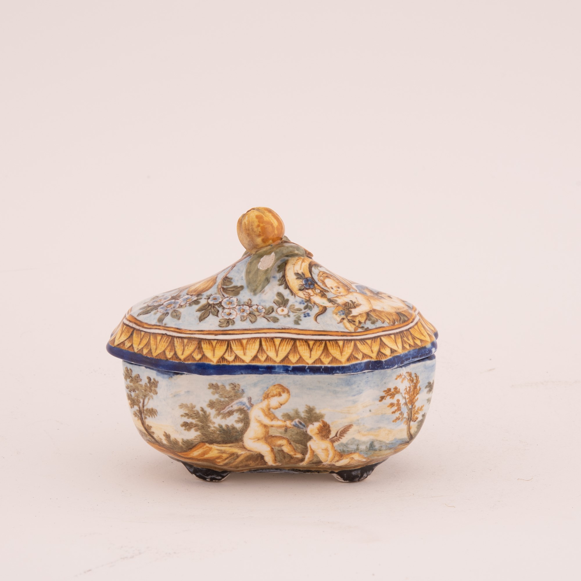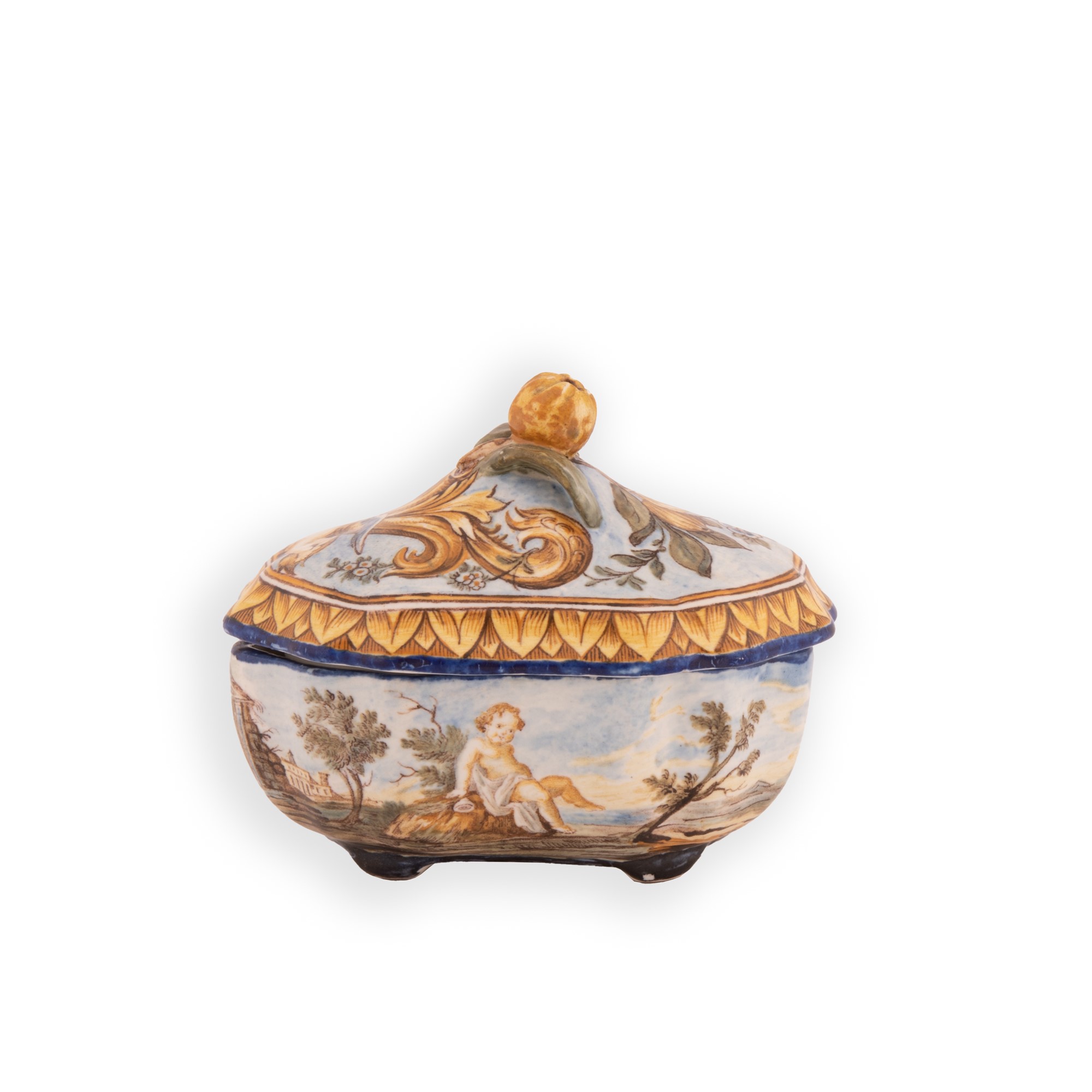 Saliera decorata sul corpo in policromia con putti e paesaggi. Coperchio decorato con putto, foglie d'acanto e fiori con presa a forma di frutto. cm 11x12