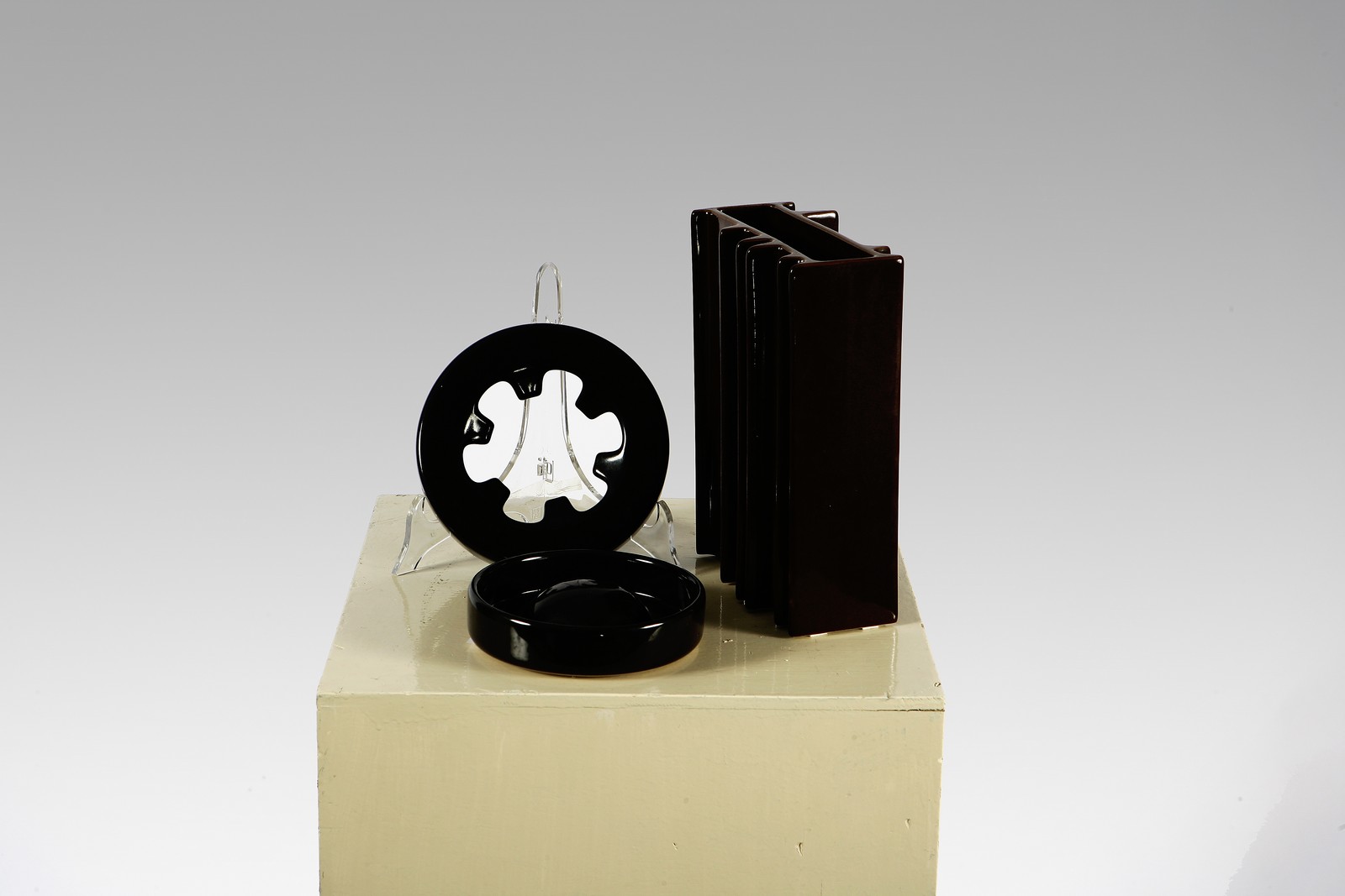 MANGIAROTTI (1921) ANGELO. Tre soprammobili della serie M, Porcellana invetriata. Vaso, posacenere e svuotatasche. Three ornaments, series M in vitreous China. Vase, ashtray and vide-posche. Prodotto da Fratellli Brambilla Milano. Produced by Brambilla Brothers Production MIlan. 1968.