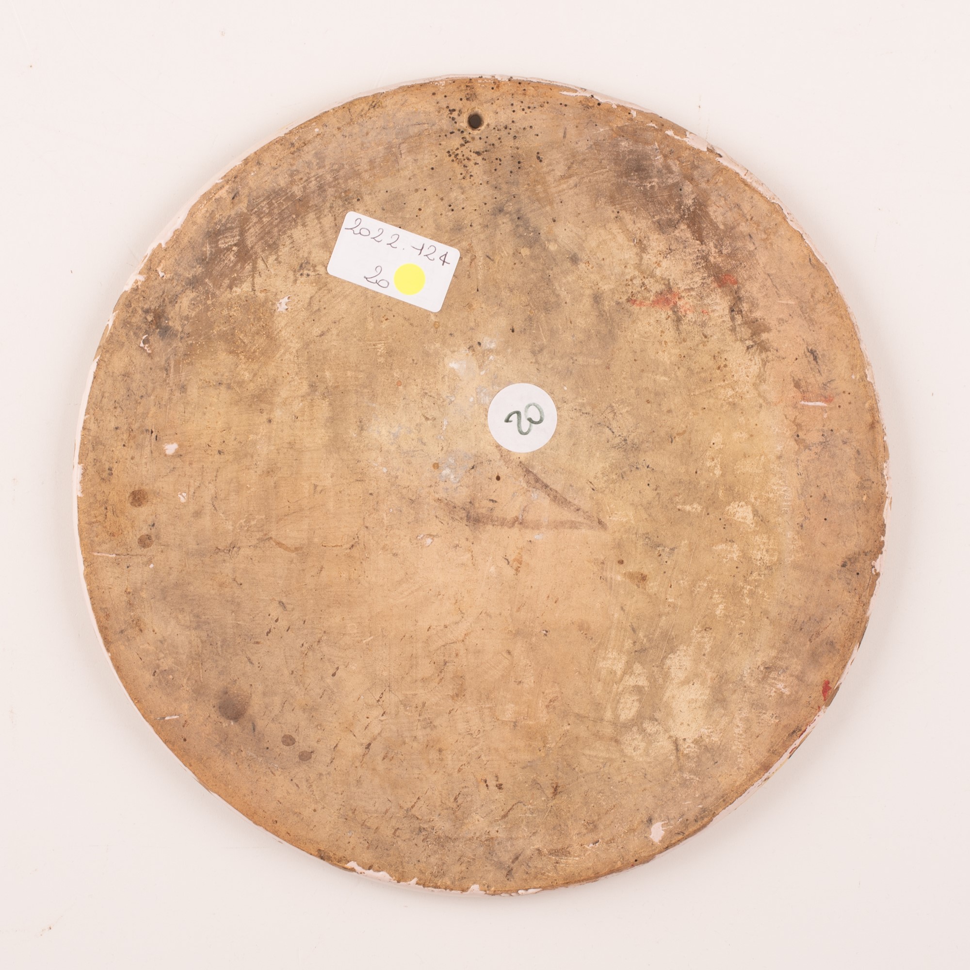 Manifattura castellana del XVIII secolo ( - ) Tondo in maiolica decorato in policromia con Madonna, Gesù Bambino e San Giovannino. Filettatura in giallo e manganese sul bordo. Ø cm 26