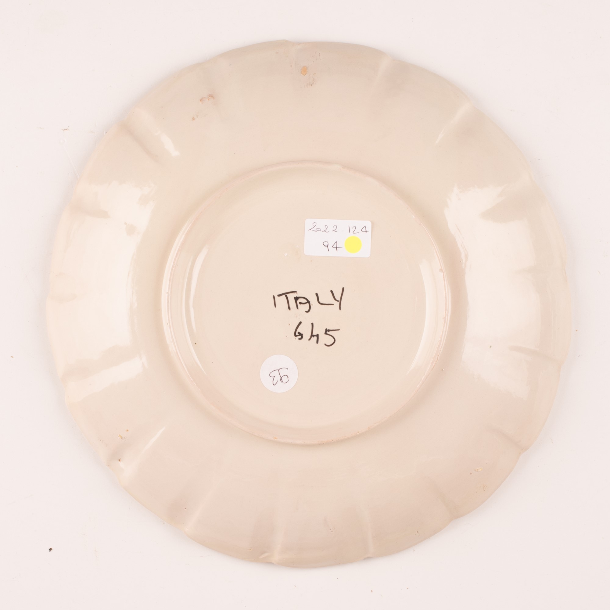 Manifattura castellana del XX secolo ( - ) Vassoio nuziale in maiolica di forma lobata decorato in policromia con fiori colorati e doppi anelli nuziali beneauguranti. Ø cm 32