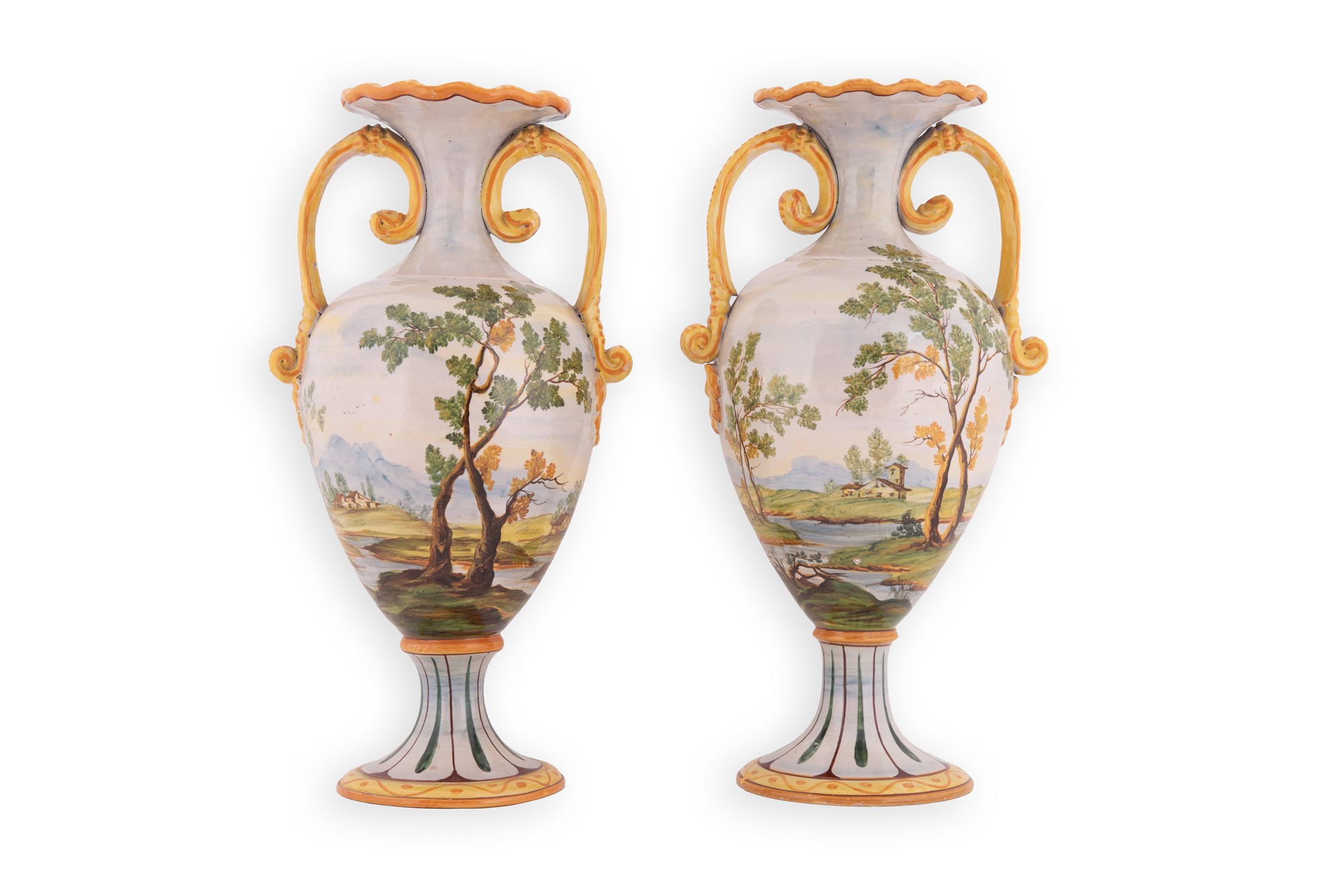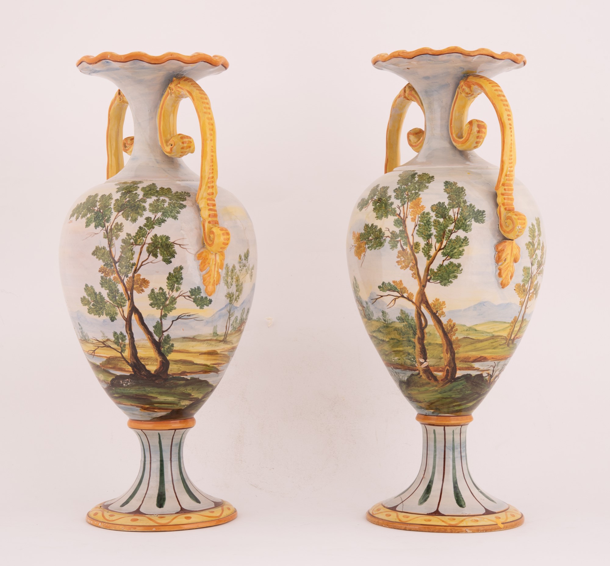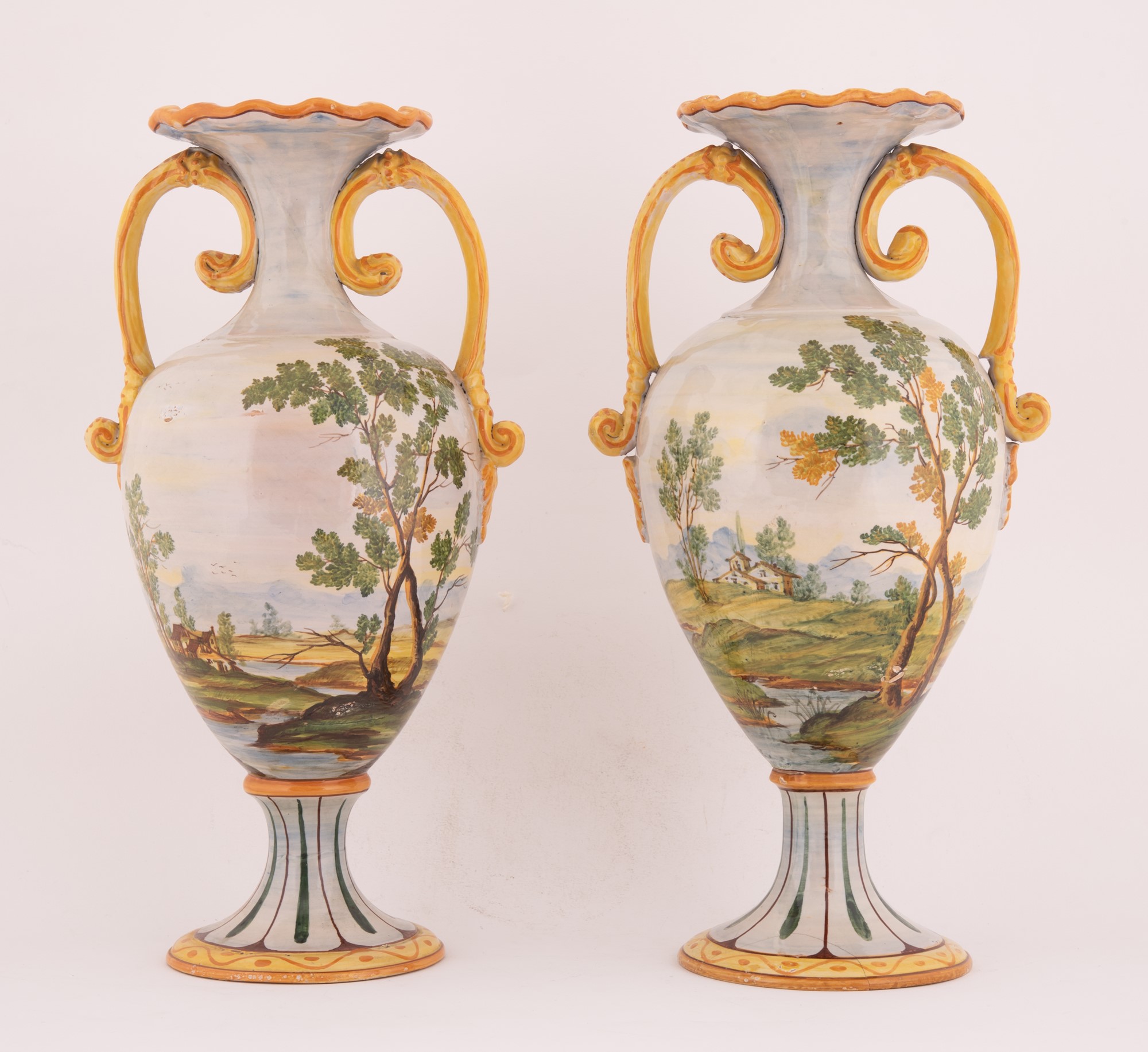Manifattura castellana del XX secolo ( - ) Coppia di vasi biansati in maiolica con corpo ad anfora su alto piede, decorai in policromia con paesaggi alberati e case. Bordo superiore ondulato. altezza cm 46