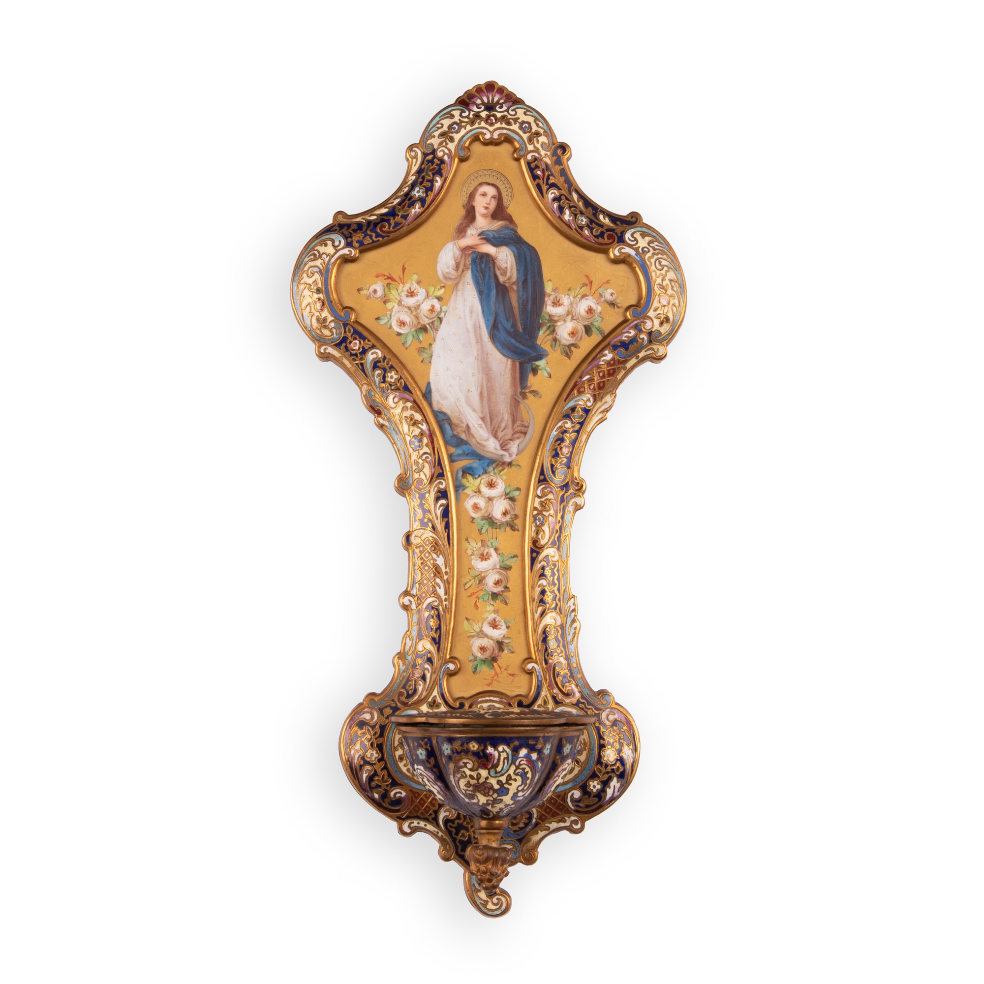 Croce ed acquasantiera in bronzo Napoleone III a smalti Cloisonnè cm 32x15,5 seconda metà del XIX secolo Al centro bel dipinto della Madonna Immacolata tra composizioni di rose bianche.