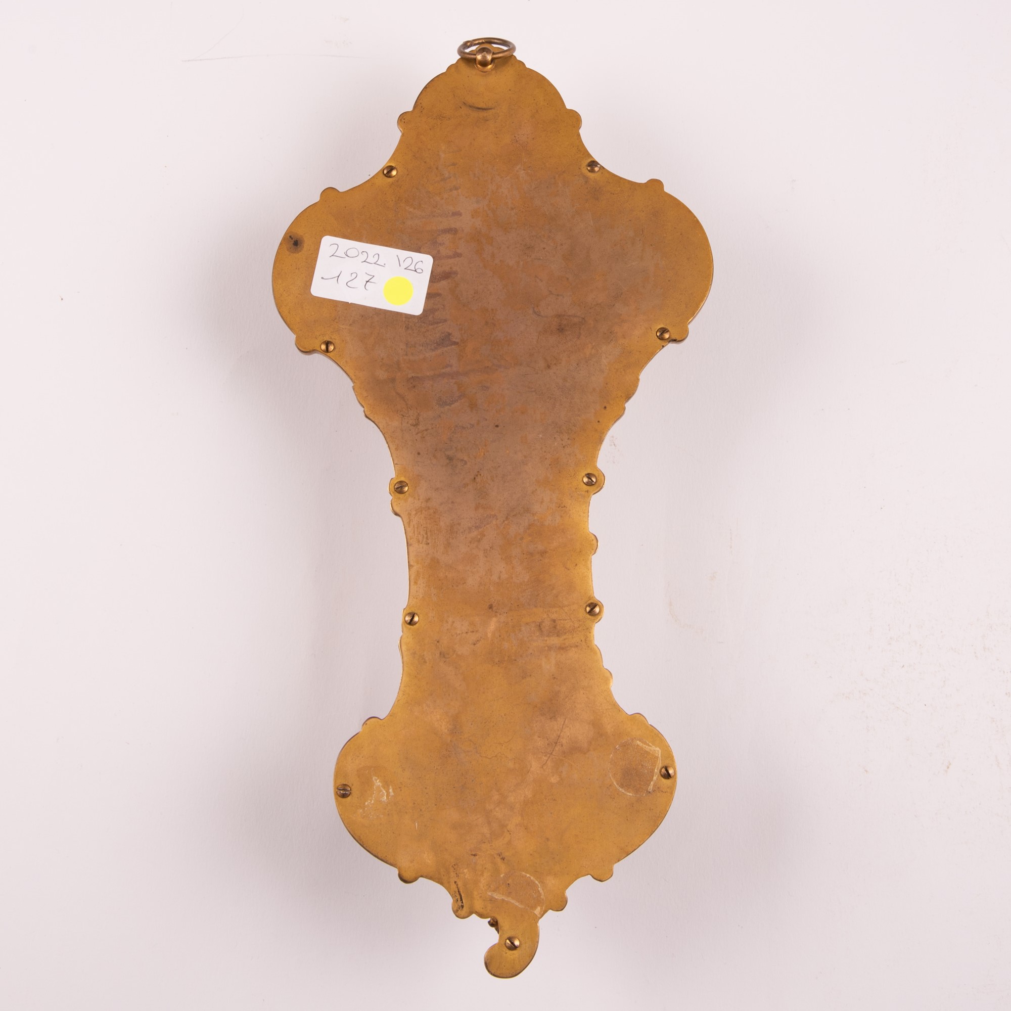 Croce ed acquasantiera in bronzo Napoleone III a smalti Cloisonnè seconda metà del XIX secolo cm 32x15,5