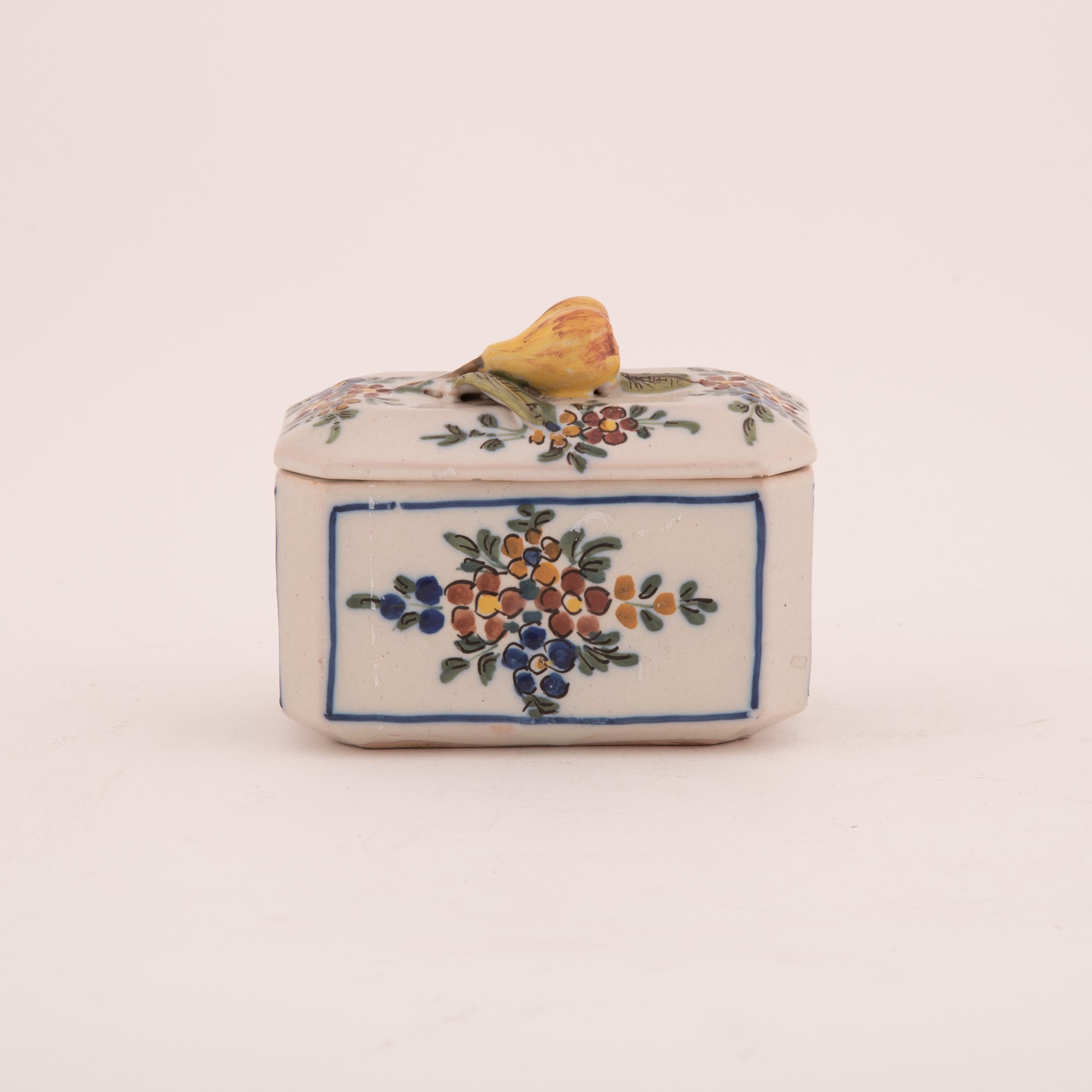 Lot 253 | Scatola in maiolica con coperchio decorata a motivi vegetali. Presa a pera. con coperchio cm 10x12; senza coperchio cm 6,5x12