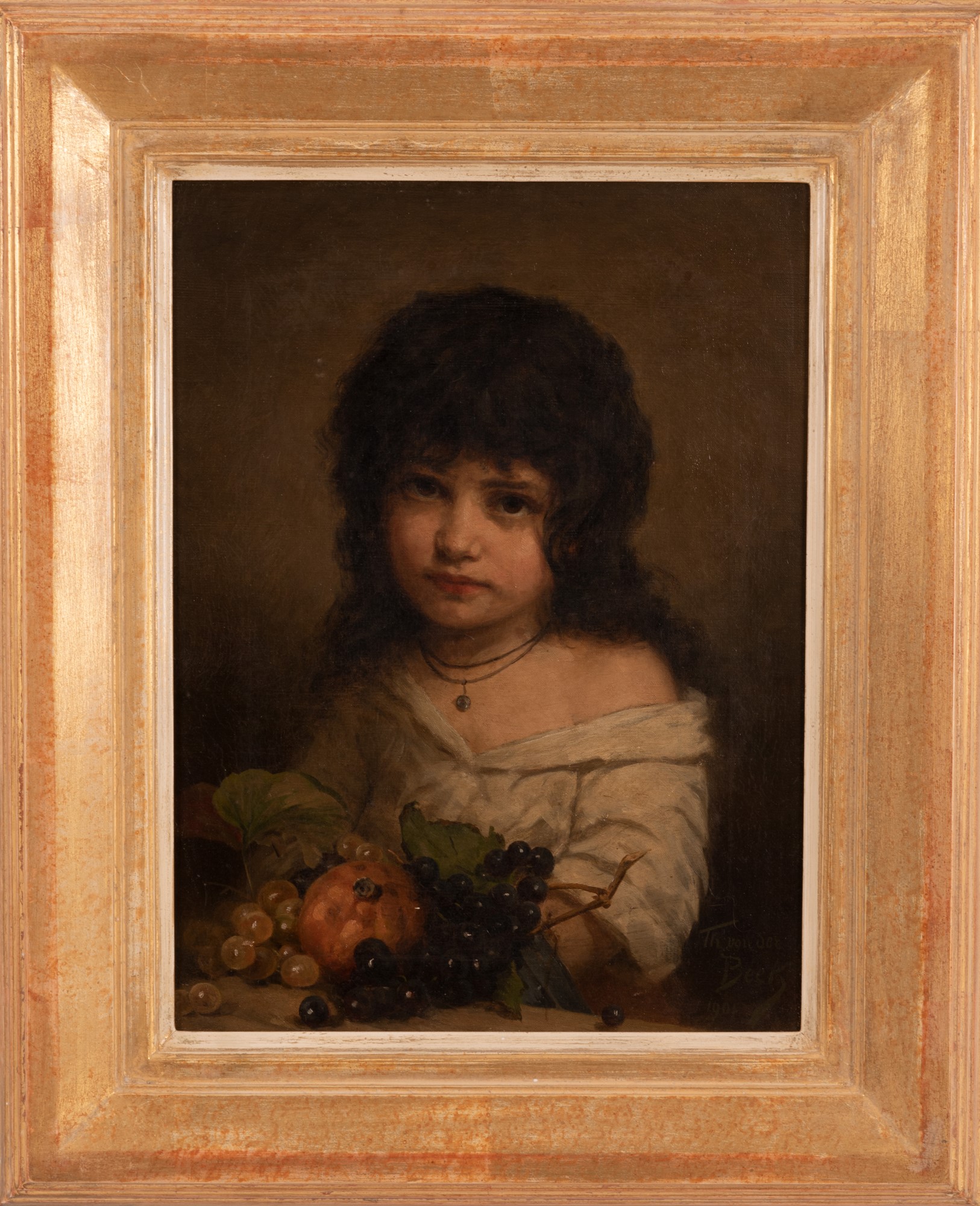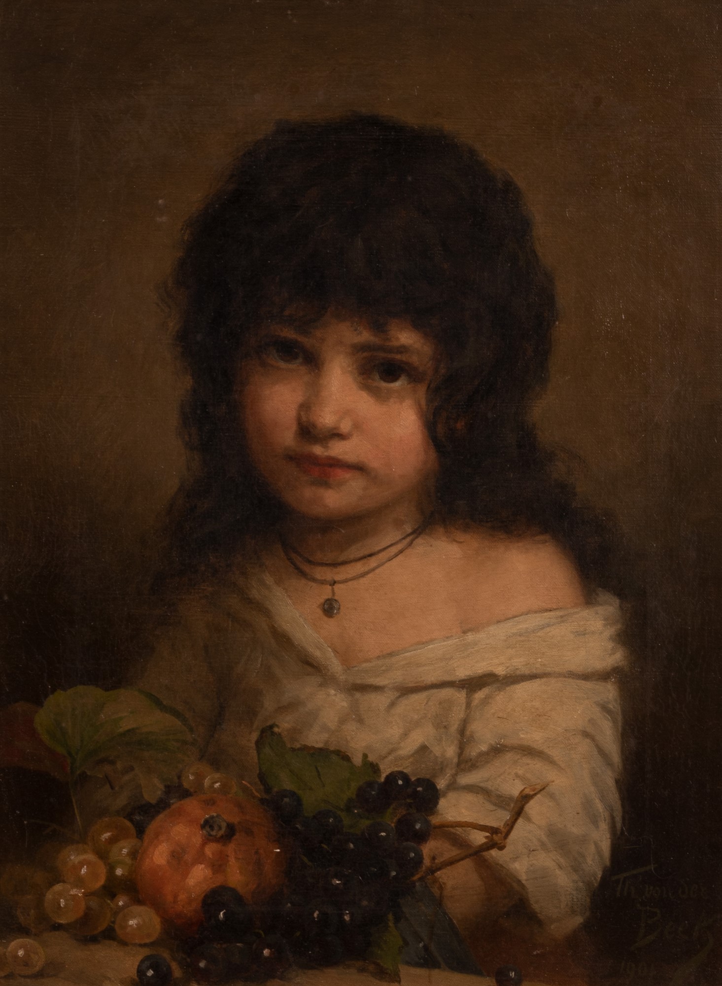 Theodor van der Beek (Kaiserswerth, 1838 - Düsseldorf, 1921) Fanciulla con uva e melograni XX secolo Olio su tela cm 40x30; con cornice cm 56x46