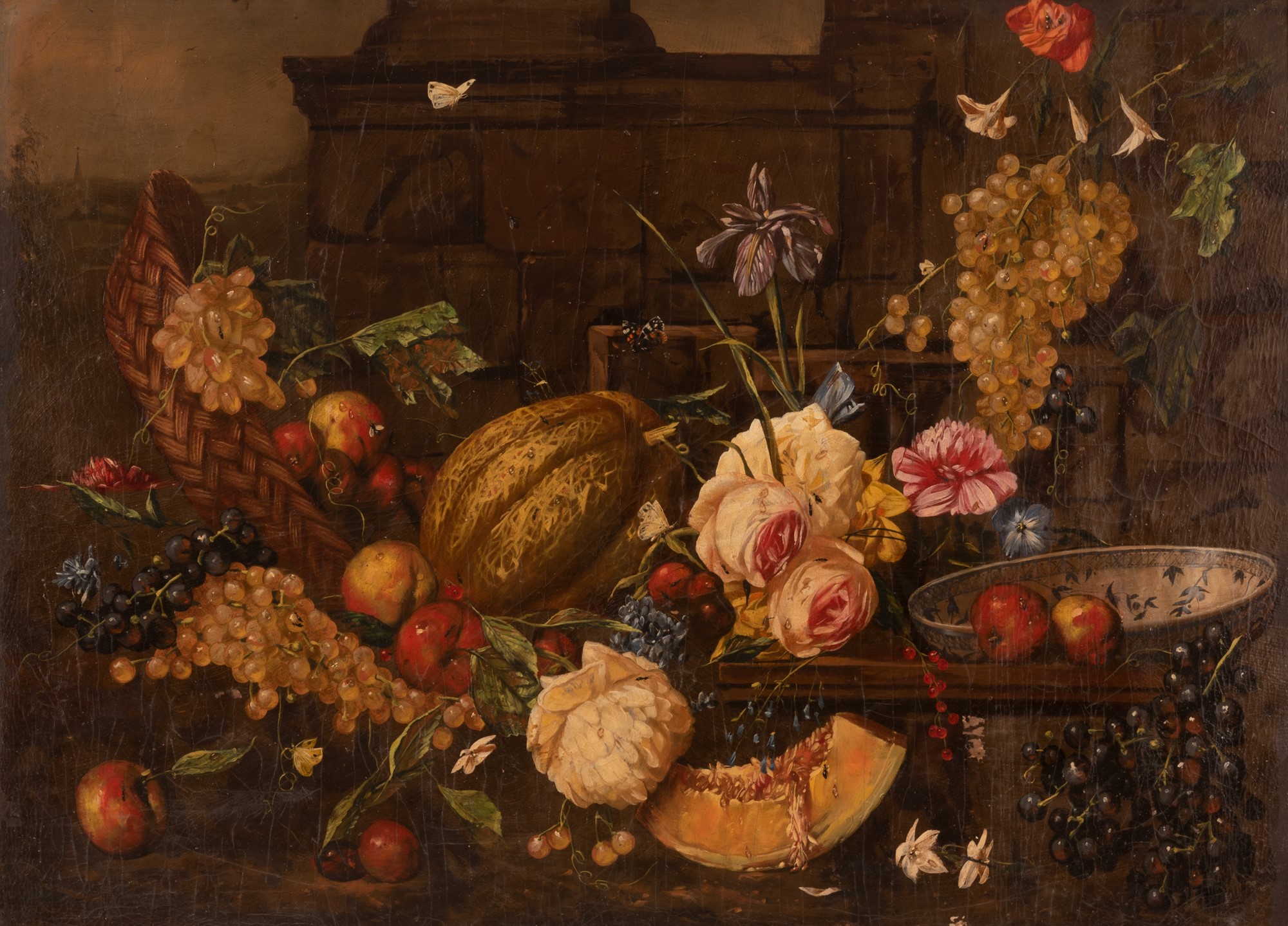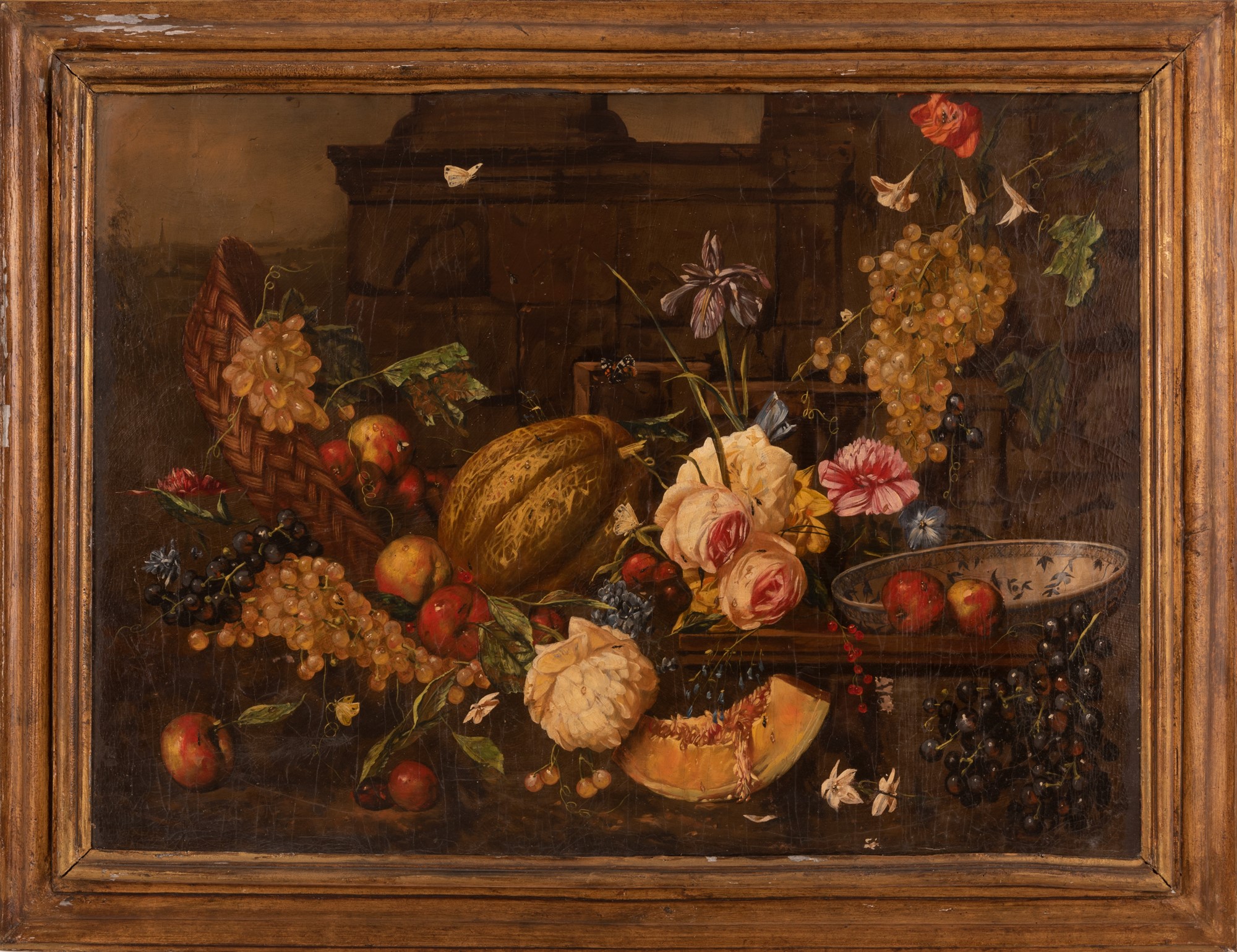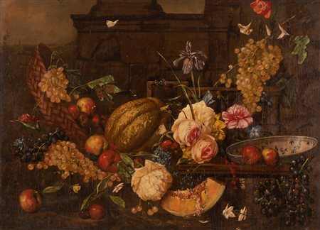 Pittore del Nord Europa del XIX secolo ( - ) Natura morta con frutta e fiori con vassoio in maiolica su un piano, con rovine sullo sfondo olio su tela cm 67x90; con cornice cm 84x110