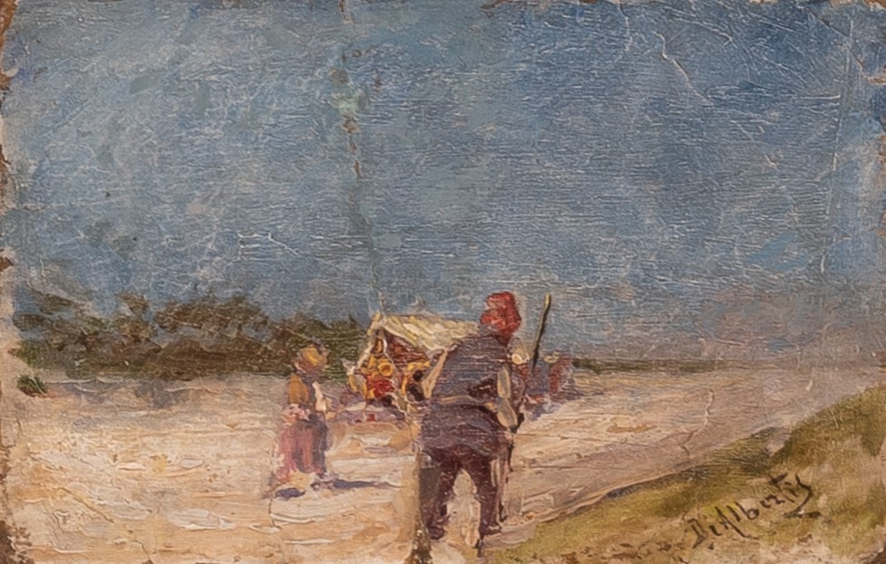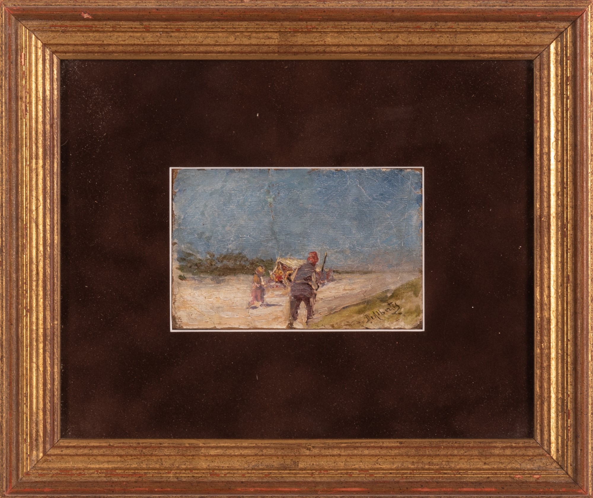 Sebastiano De Albertis (Milano, 1828 - Milano, 1897) Paesaggio con figure Olio su tavola cm 8x13; con cornice cm 26x31