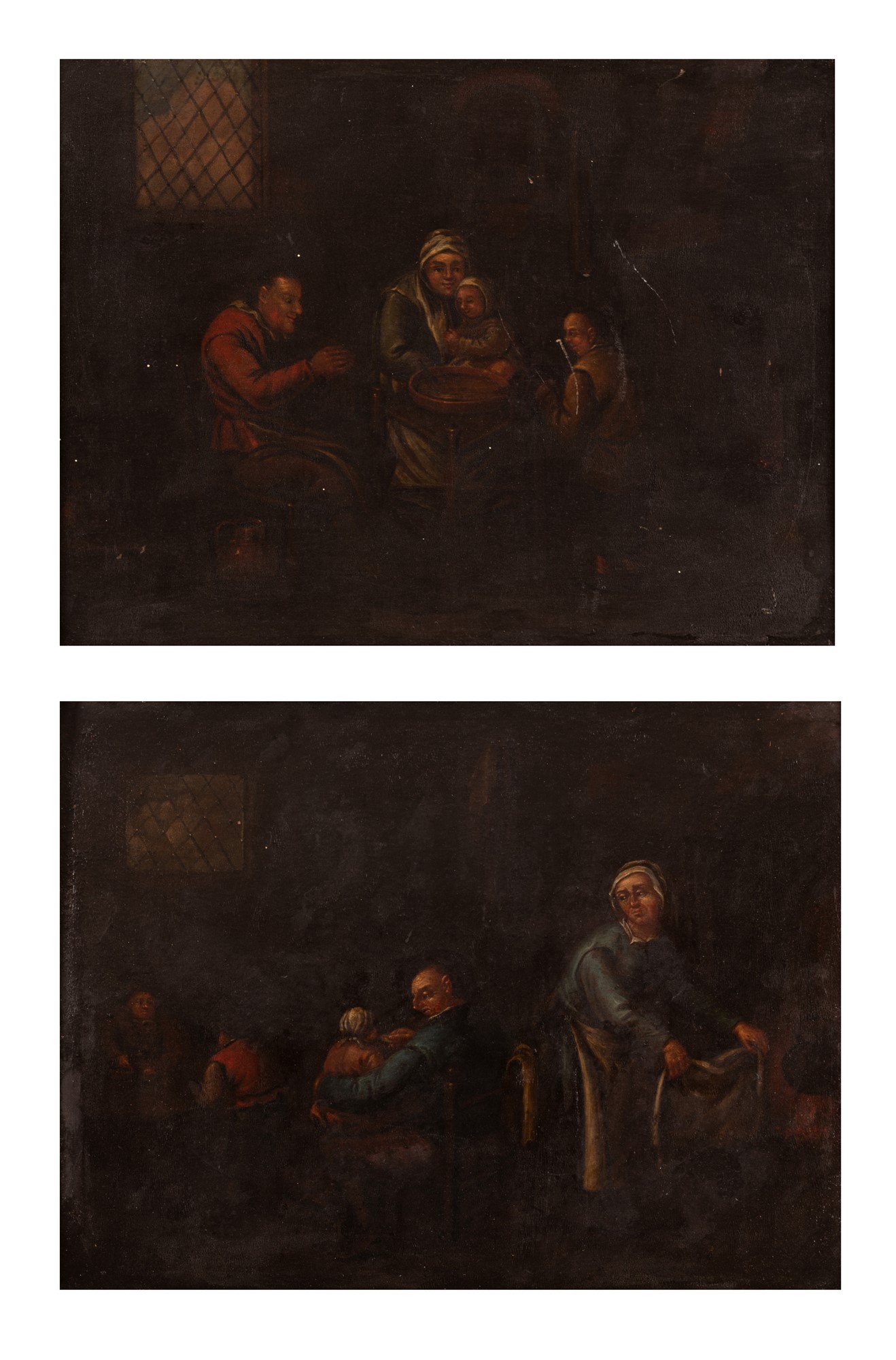 Due dipinti raffiguranti scene di interno di cucina con figure