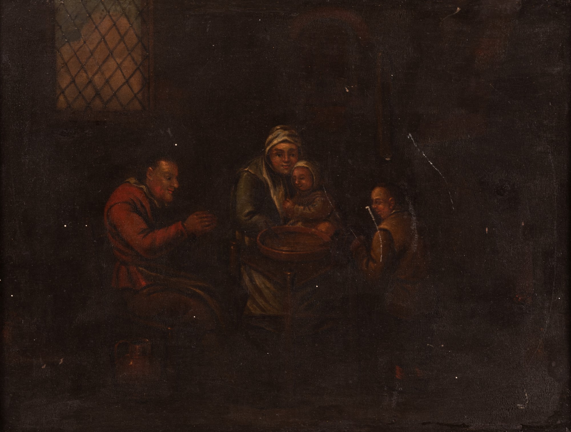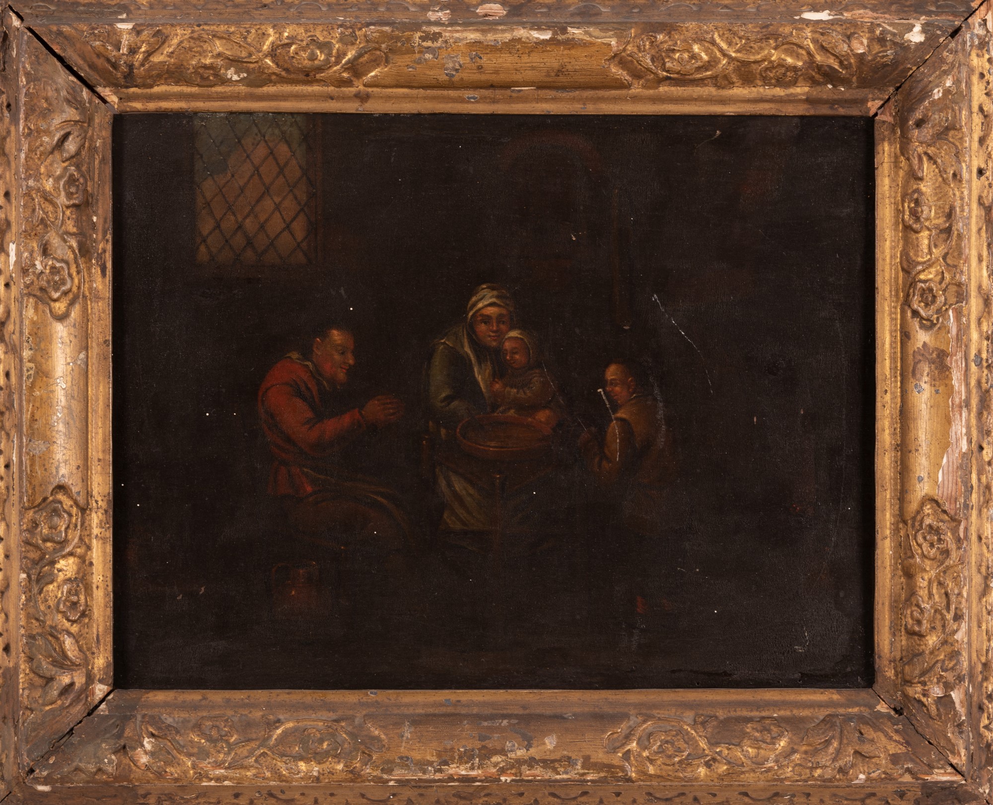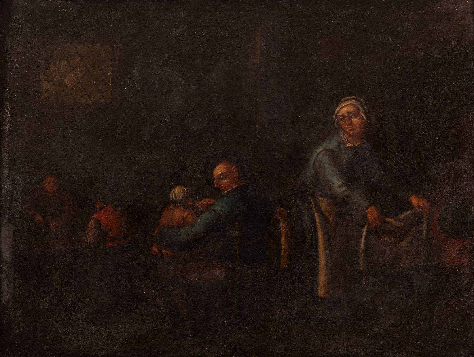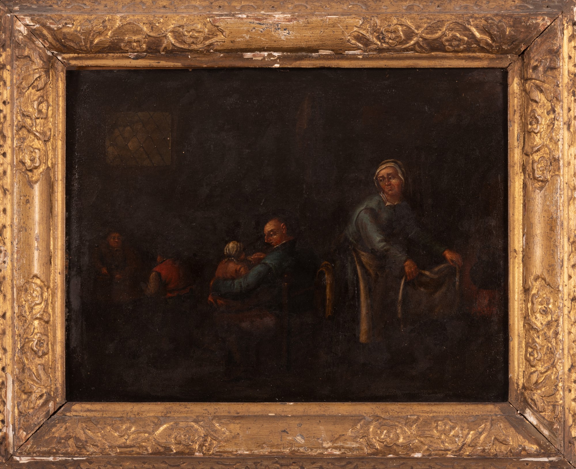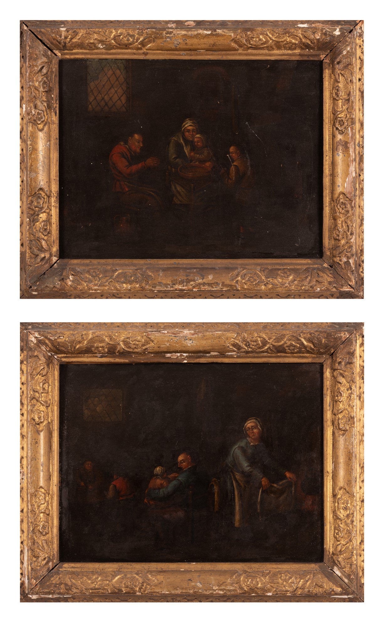 Pittore fiammingo del XIX secolo ( - ) Due dipinti raffiguranti scene di interno di cucina con figure olio su tavola cm 30x40; con cornice cm 42x50
