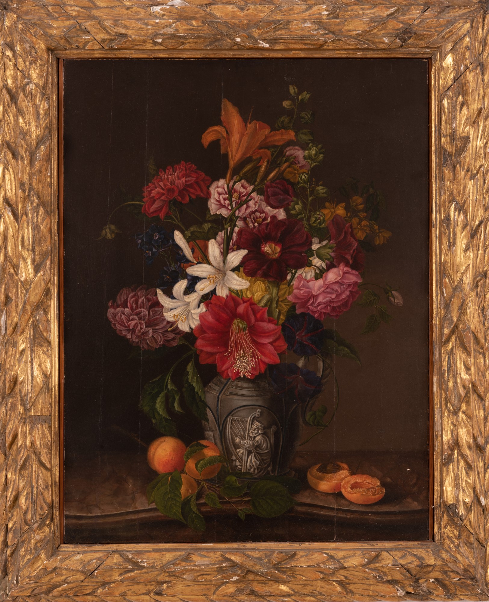 Scuola Fiamminga XIX secolo ( - ) Natura morta con fiori in vaso di metallo olio su tavola cm 67x52; con cornice cm 83x68