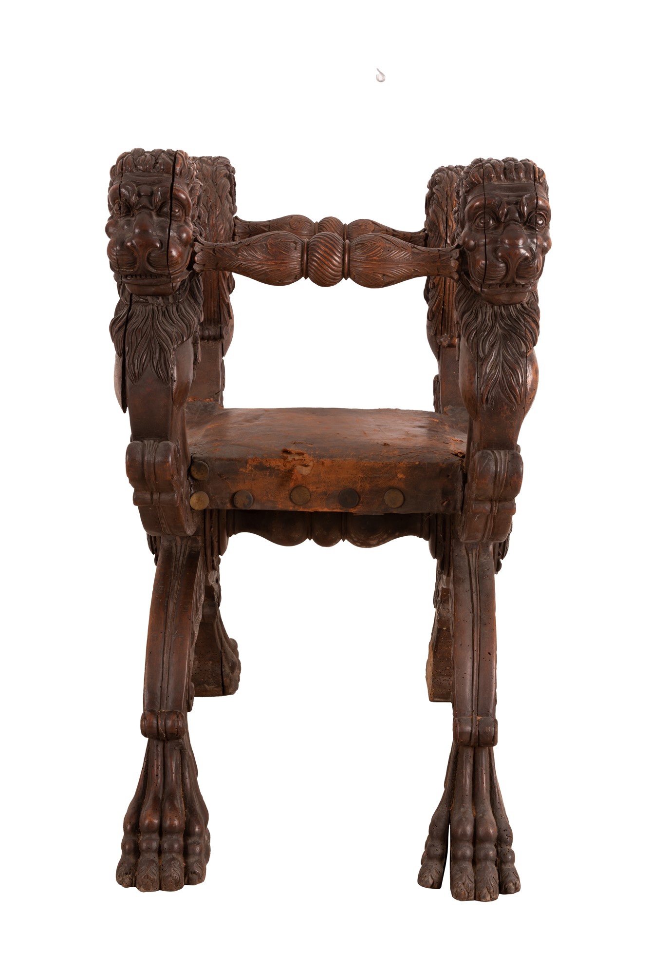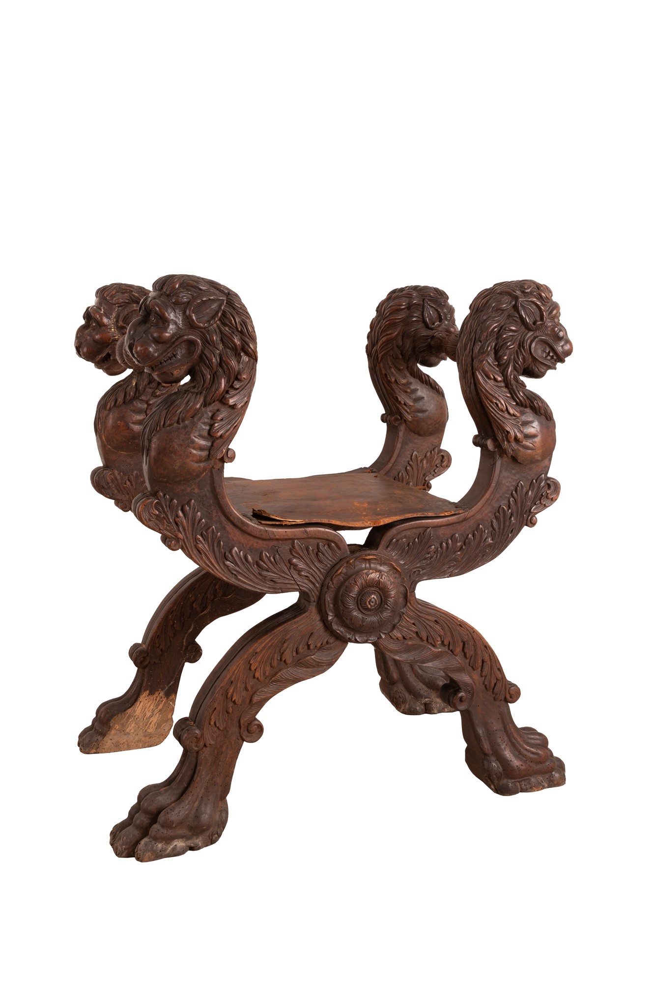 Faldistorio in stile eclettico con appoggi intagliati a teste leonine e piedi ferini