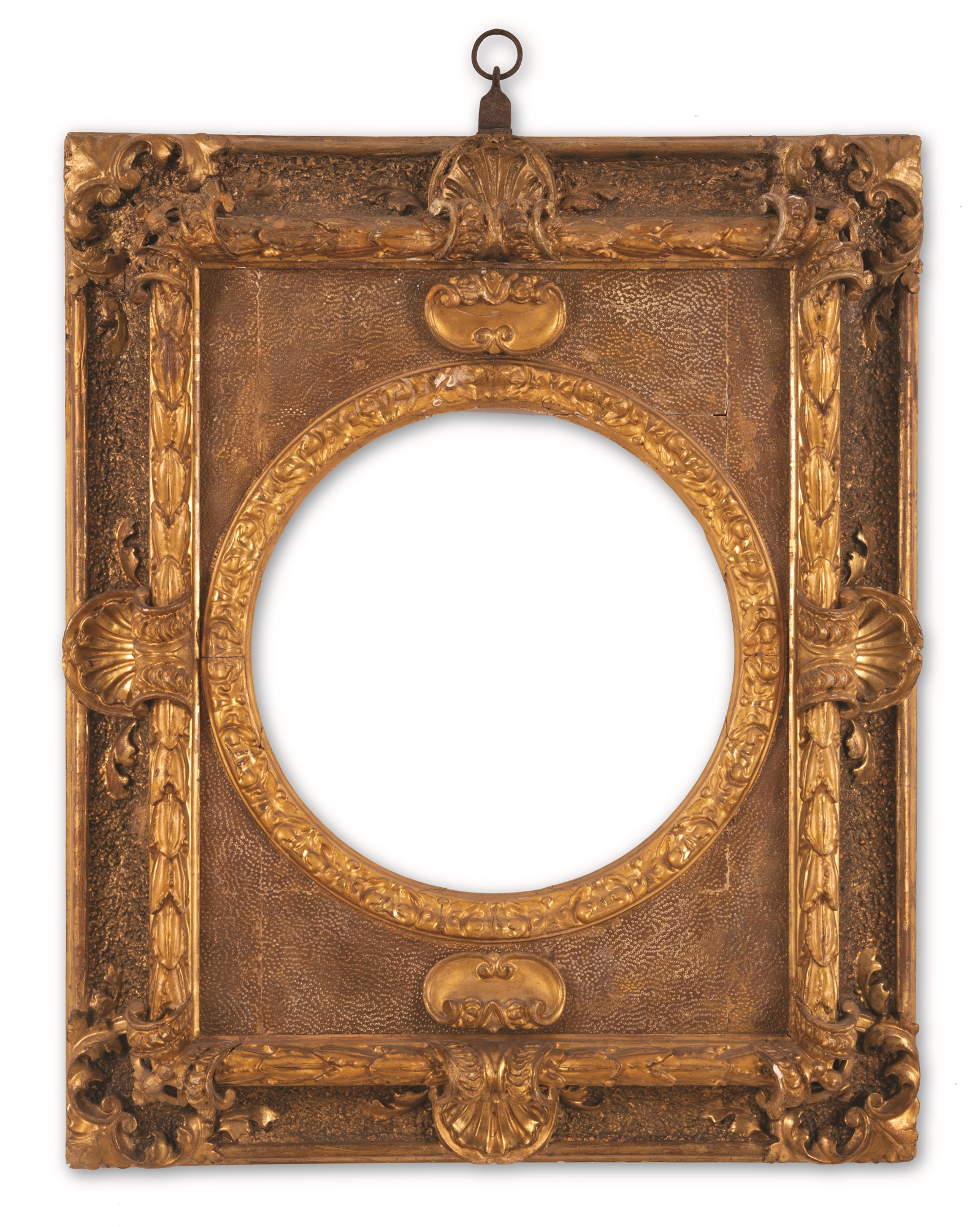 Lot 362 | Manifattura dell'Italia centrale della fine del XVIII secolo ( - ) Cornice in legno e pastiglia dorata, decorata con volute e conchiglie. luce Ø cm 38; cornice cm 87x 68