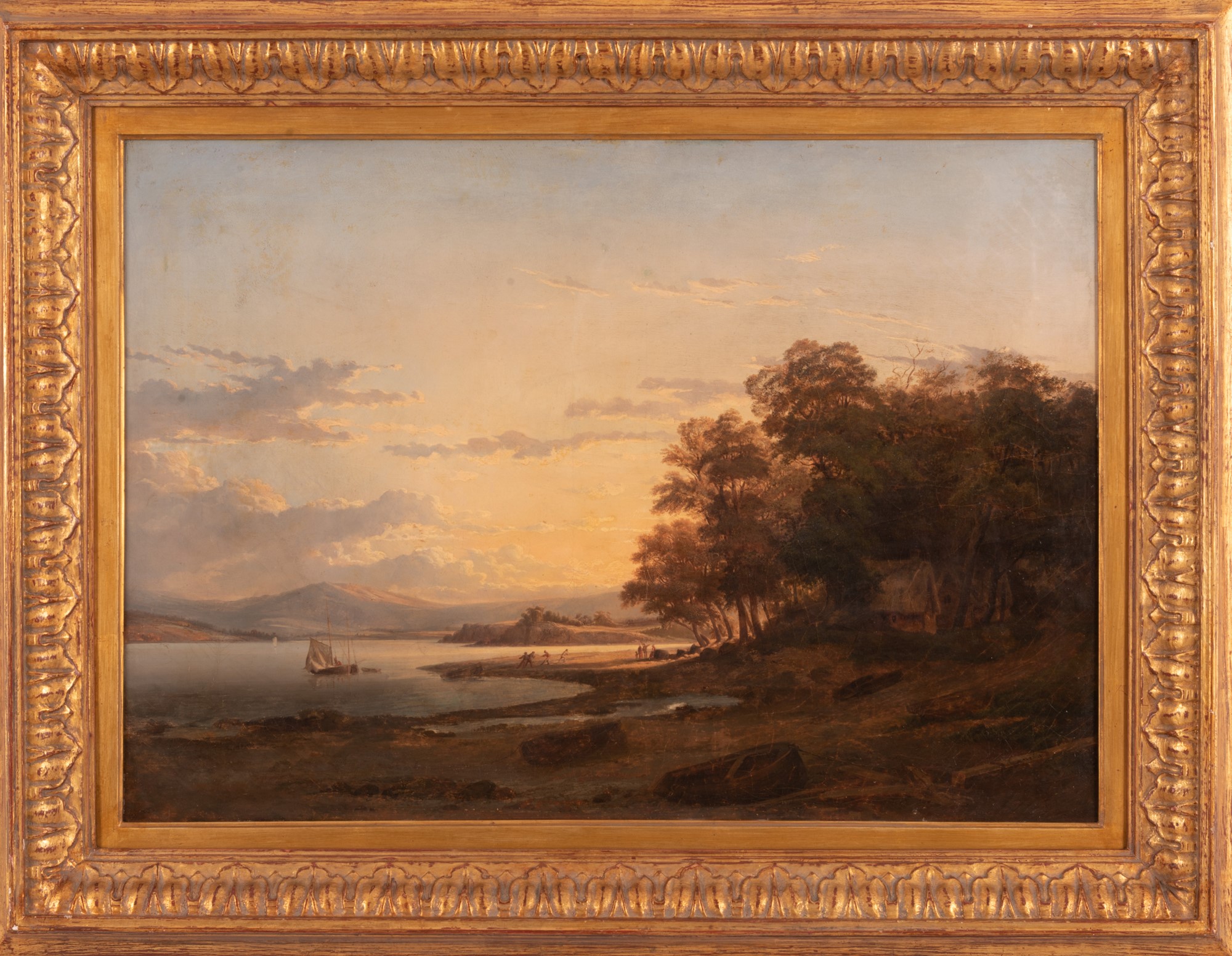 Scuola veneta del XIX secolo ( - ) Paesaggio lacustre con pescatori olio su tela cm 58x82; con cornice cm 81x105