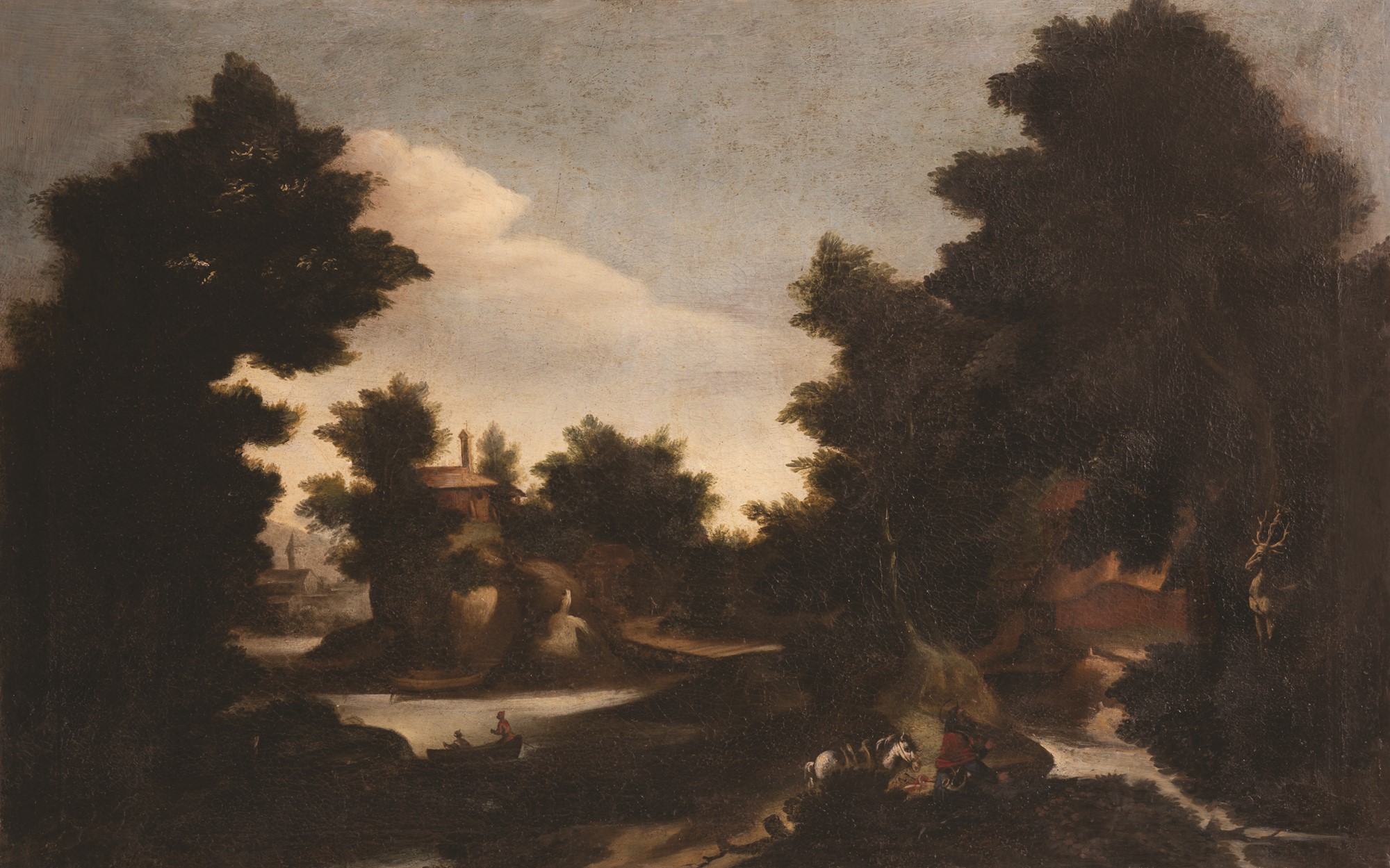 Pittore fiammingo del XVIII secolo ( - ) Dipinto raffigurante la conversione di Sant'Eustachio Olio su tela cm 66x104