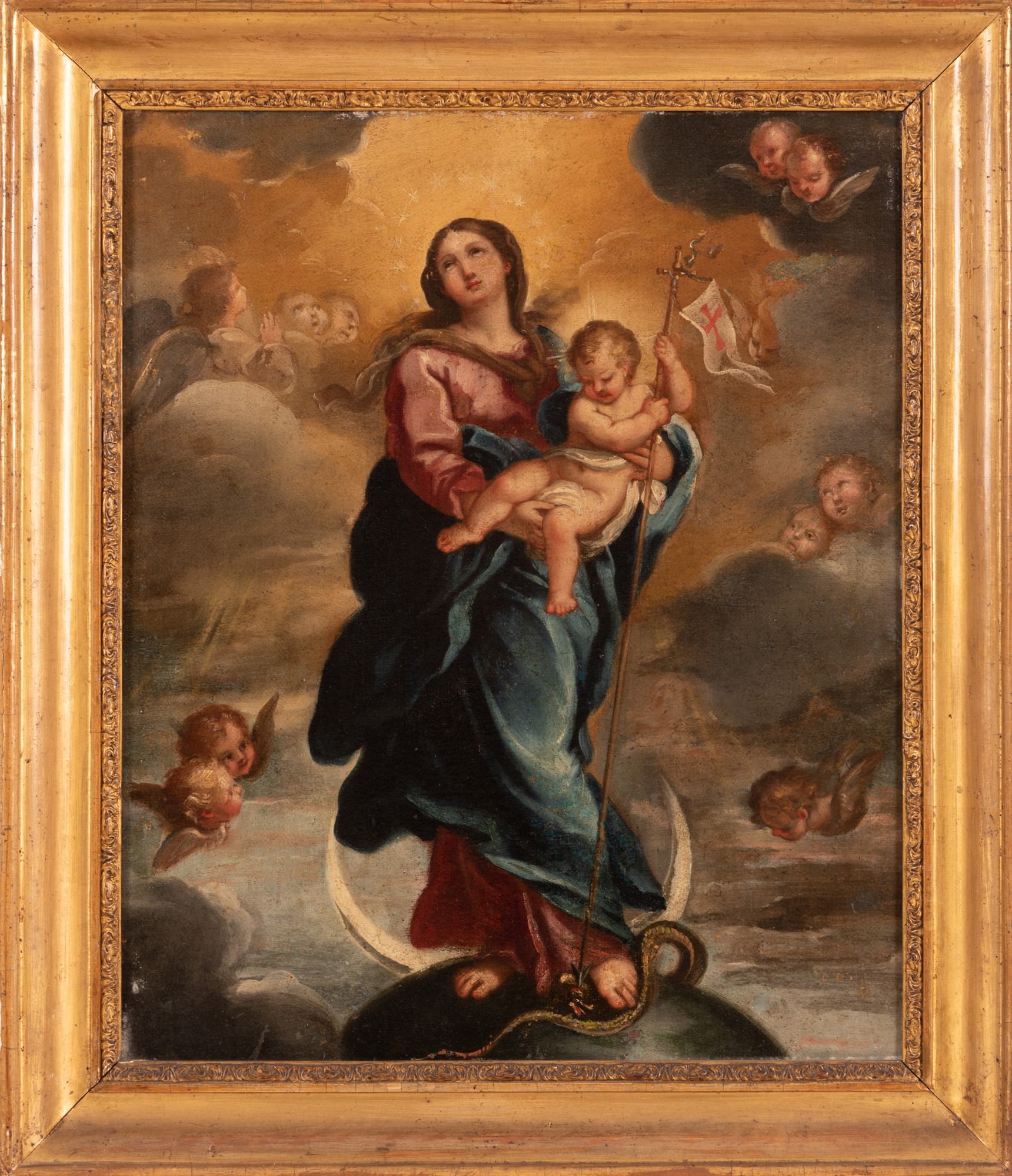 Sebastiano Conca (attribuito a) (Gaeta , 1680 - Napoli, 1764) Vergine Immacolata con Gesù bambino olio su tela cm 44x36; con cornice cm 53x46