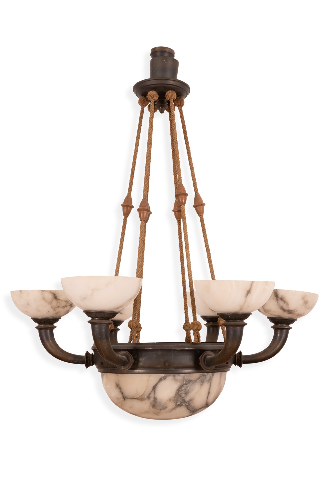 Lot 381 | Lampadario a 6 luci in bronzo e alabastro d'epoca Decò primi del XX secolo cm 130x110
