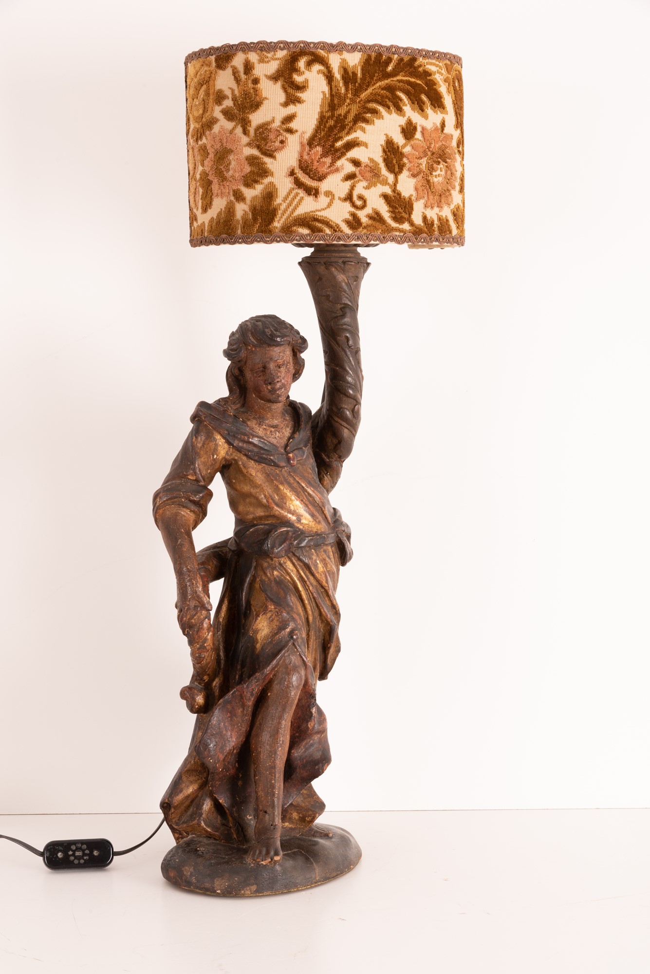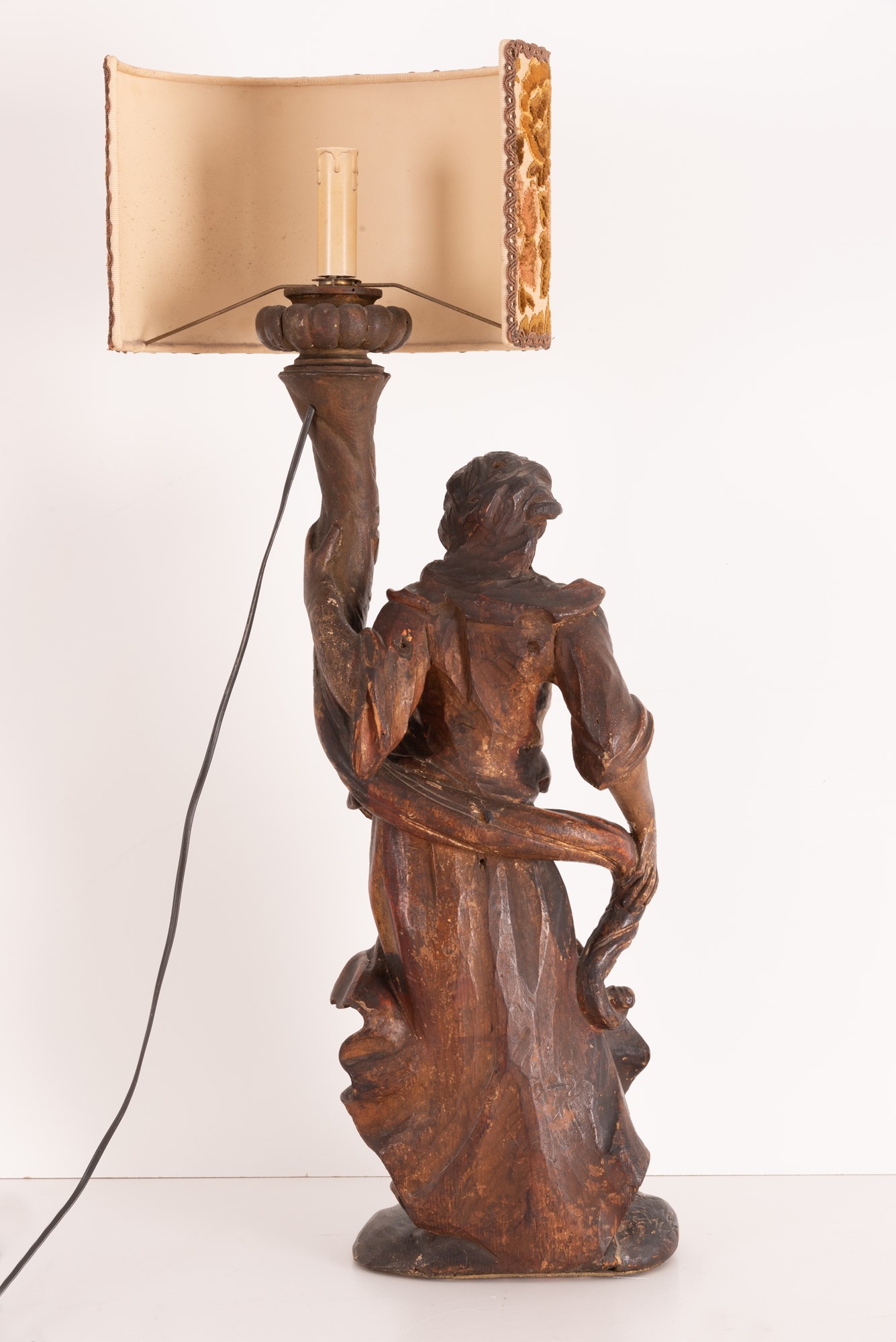 Scultura in legno policromo raffigurante angelo tedoforo. XVII secolo