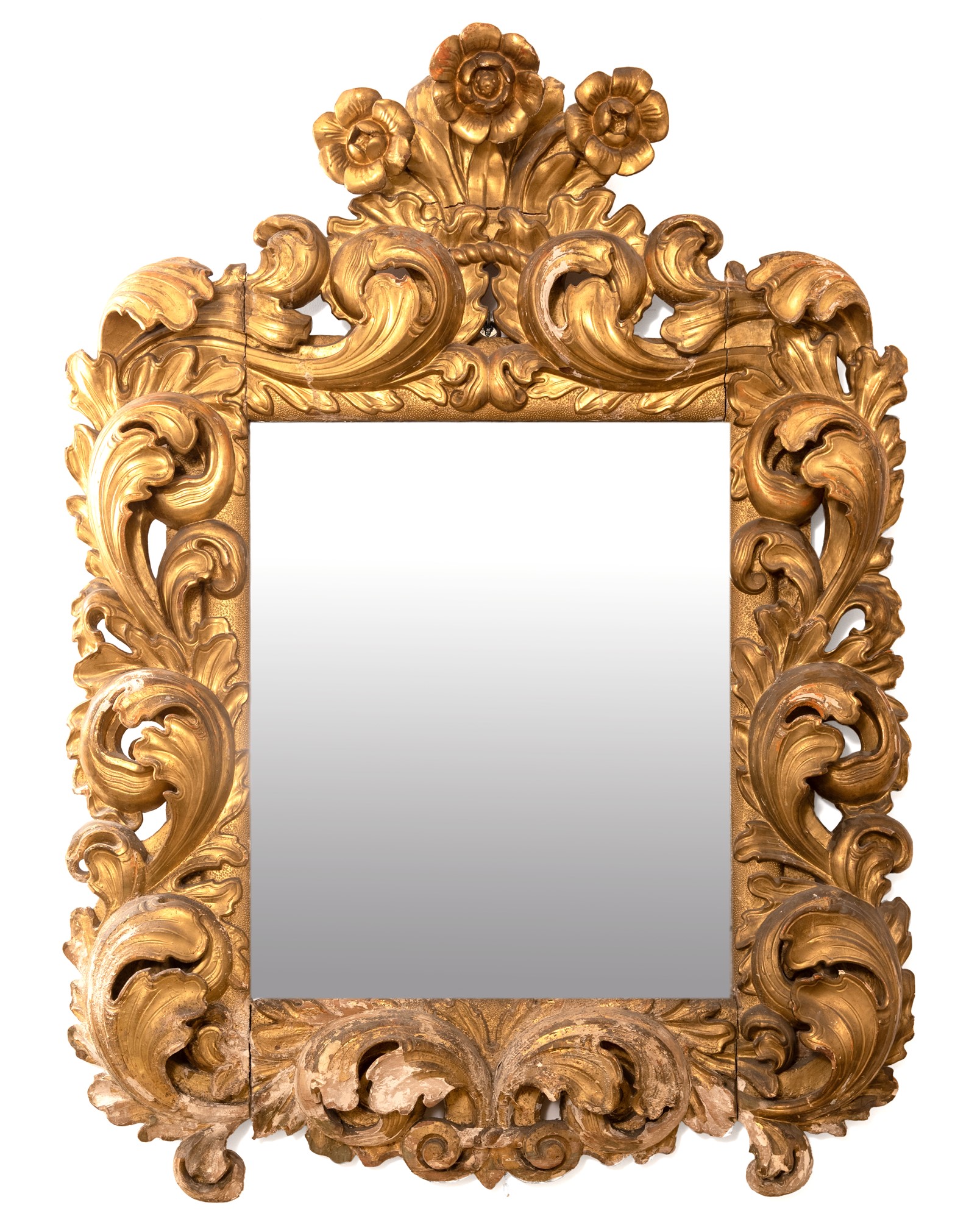 Manifattura emiliana del XVII secolo ( - ) Specchiera a cartoccio in stile Luigi XIV Legno intagliato e dorato cm 140x105 / luce 73x60