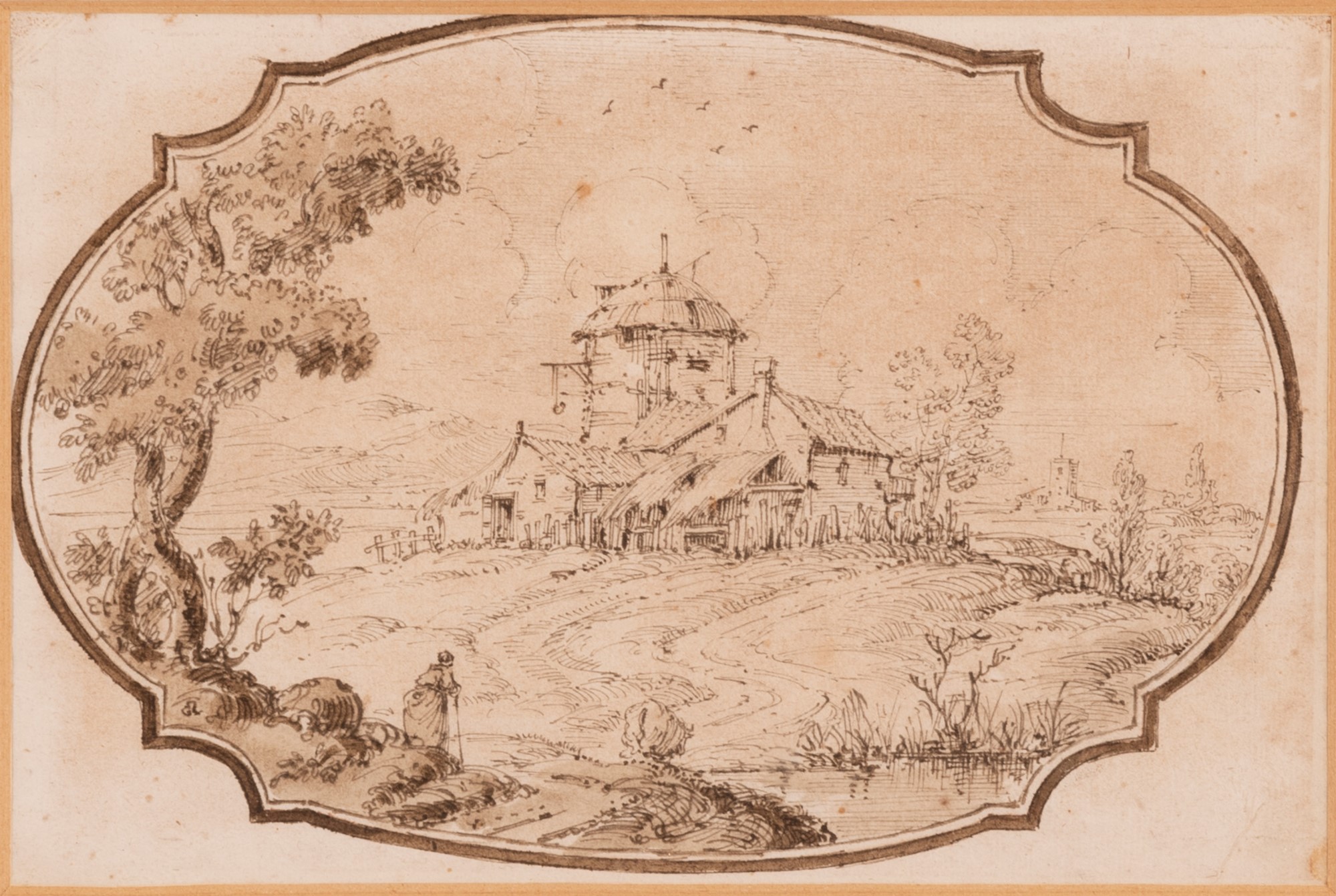 Marco Ricci (attribuito a) (Belluno, 1676 - Venezia, 1730) Paesaggio con casolare tecnica mista su carta (penna e inchiostro bruno) cm 15x21; con cornice cm 35x45