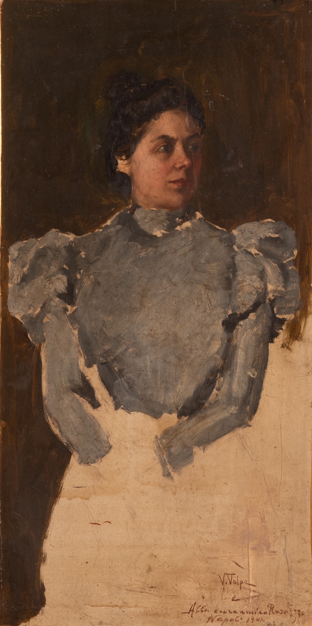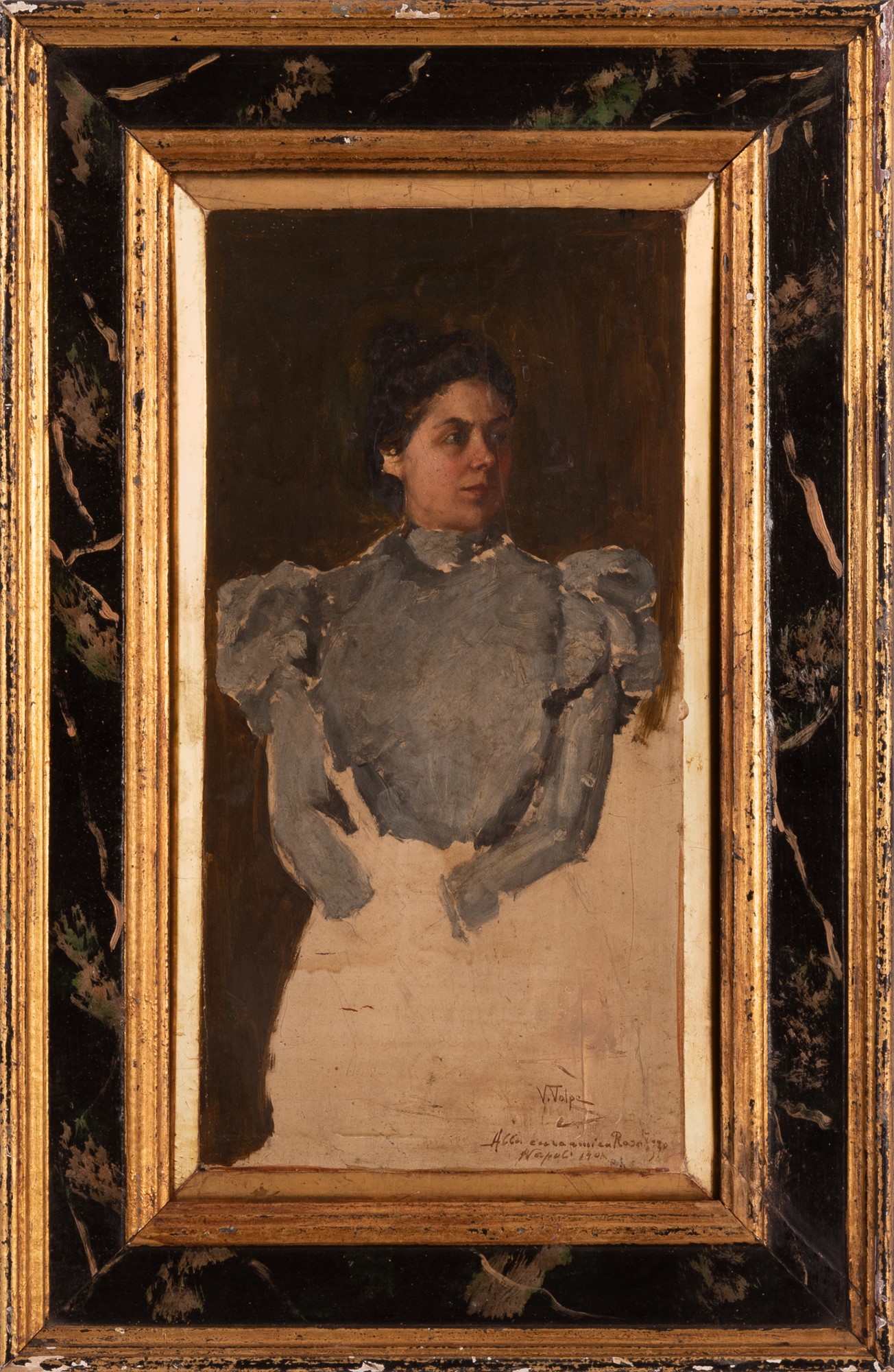 Vincenzo Volpe (Grottaminarda, 1855 - Napoli, 1929) Ritratto della signora Izzo Olio su tavola cm 36x20; con cornice cm 49x32